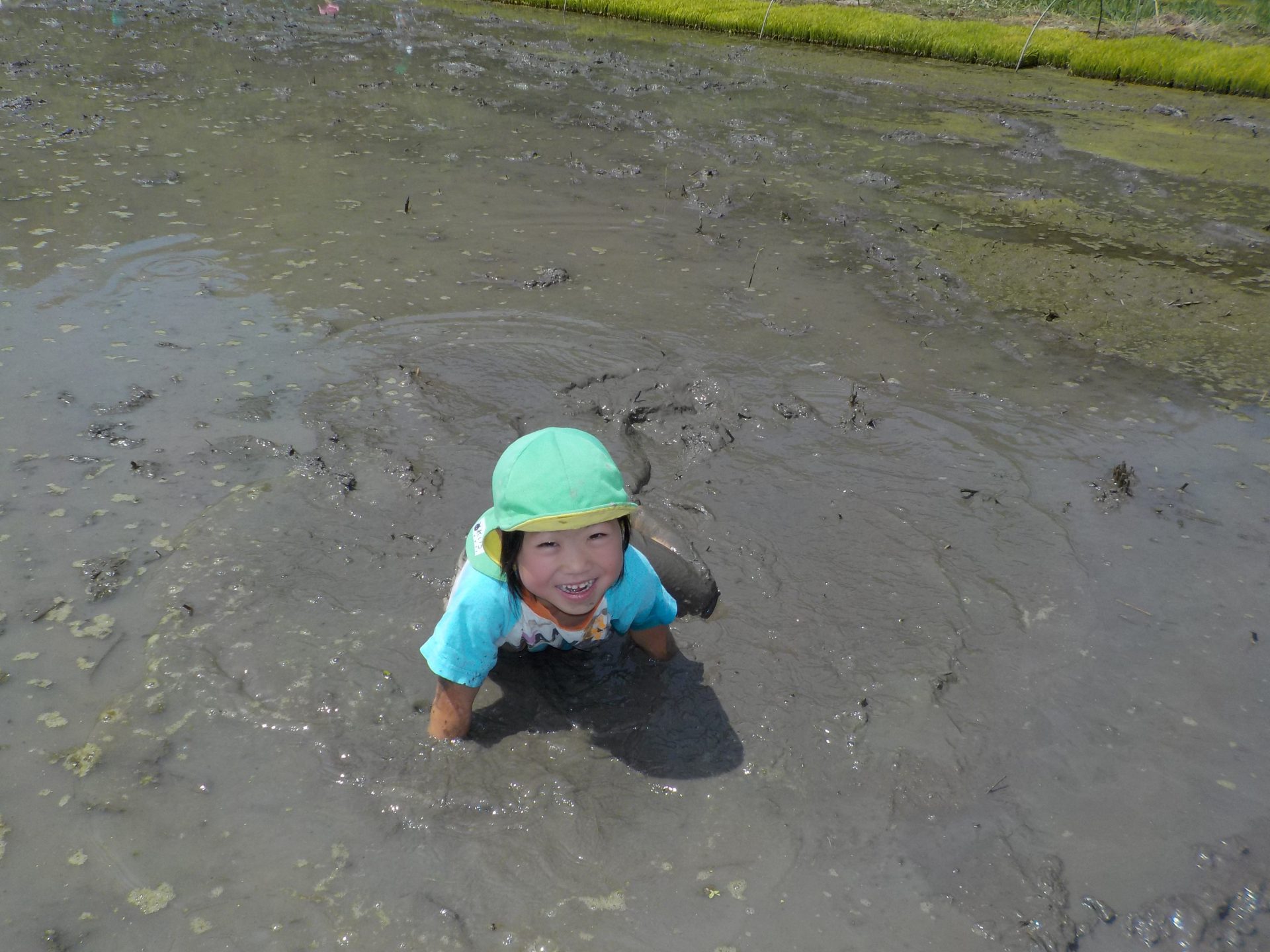 *お田植前の田んぼで遊ぶ経験も今では少なくなりました。大切な田んぼを子どもたちのために使わせてくださった保護者の方に感謝の気持ちでいっぱいです。砂場の泥と田んぼの泥の違いを感じたり、全身で泥の感触を感じることができました。