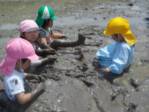 だんだんと遊びも大胆になってきました・・。「おへその所まで入っても大丈夫」「ヌルヌル、ぺたぺたおもしろいな~」年長さん、年中さんの様子を見ていた年少さんも「私もやってみる!」「キャーヌルヌルだ~!」遊びだしました。