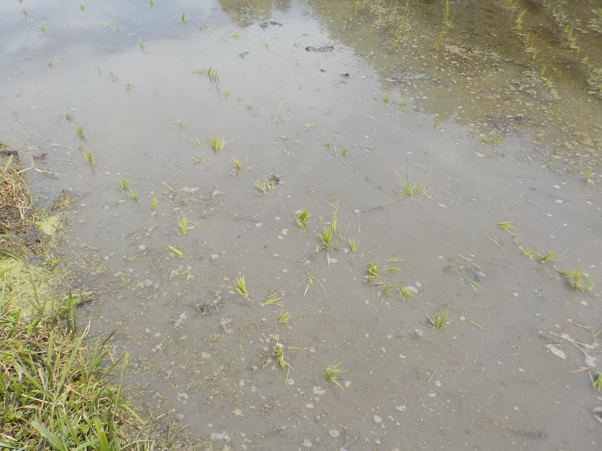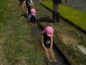 子ども達が植えた苗です。「なんだか曲がっちゃった」「苗が浮いてる?大丈夫かな~」清水さんが見に来てくれました。「ちゃんと植えれとるぞ。いいぞいいぞ。」「上手でなくてもいいんだ。体験してみる事が大事なんだよ」「お米ができたら稲刈りもたのむぞ」お田植が始まる前の田んぼでいろいろな事を体験させていただいる子どもたちです。