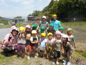 「あ~おもしろかった!」田んぼを貸してくれた保護者のお父さん、お母さんと一緒にハイ!ポーズ!「また遊びたーい」「来年もよろしくおねがいします」さあ。保育園に帰ってお湯シャワーしよう!
