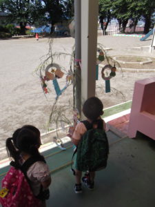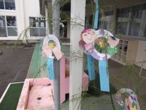 七夕という季節の行事について、年少組はまだ難しい部分もあったようですが、少し興味をもってくれるといいなと思いながら、製作に取り組みました。年長組は織姫と彦星のお話についてある程度理解もできていると思うので、少し夜空を見上げて、思いを馳せてくれるといいな…なんて、思いました。