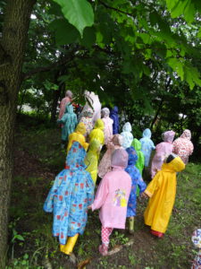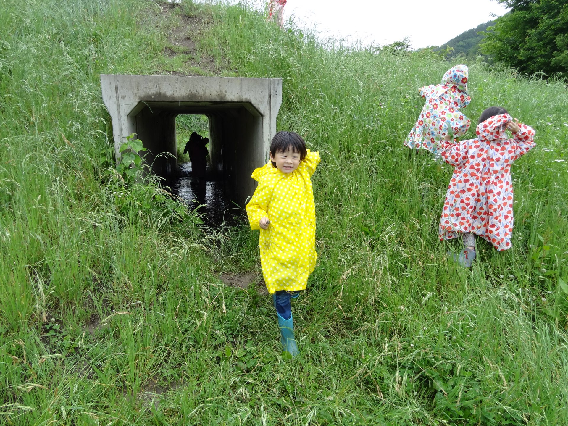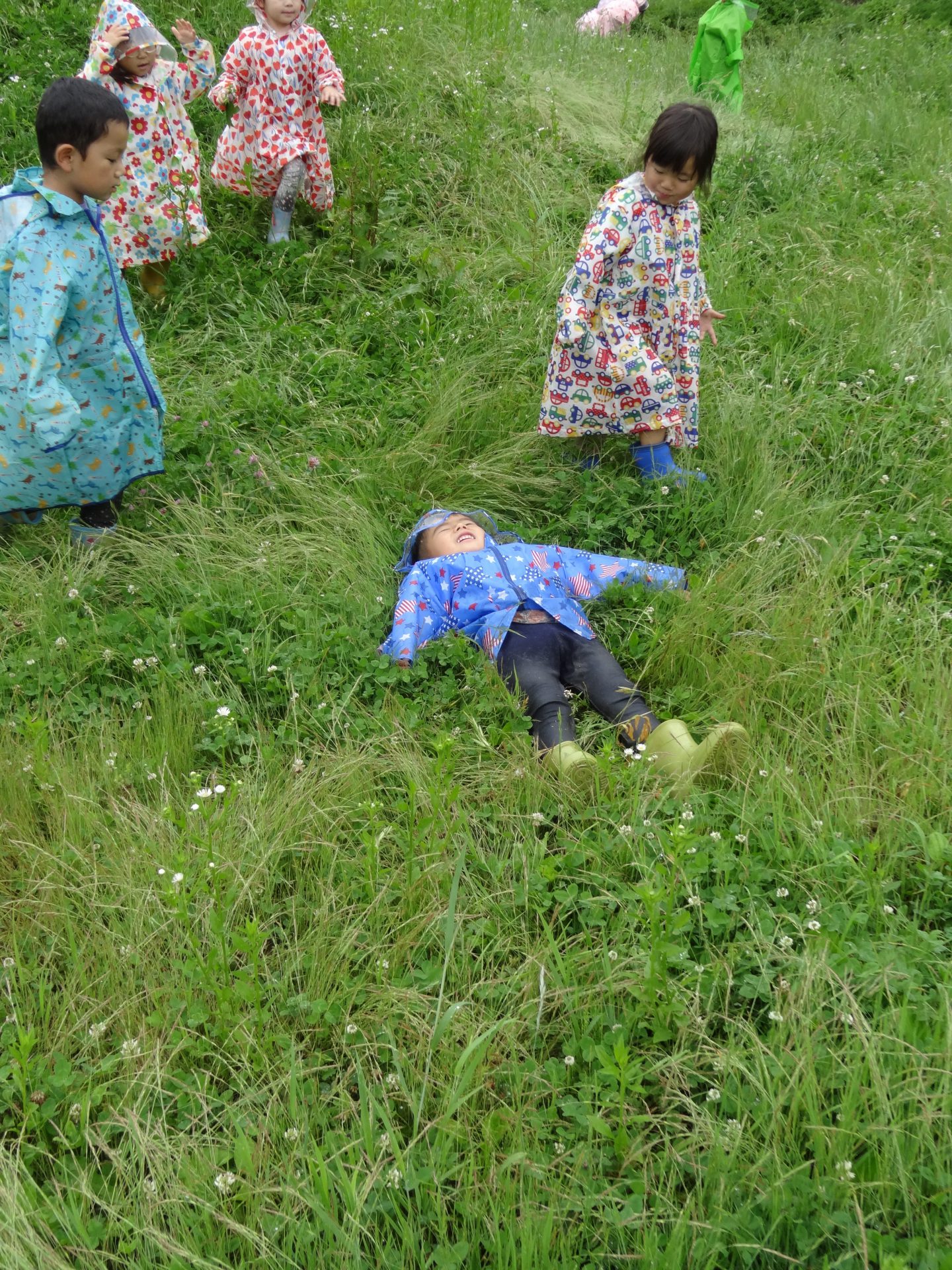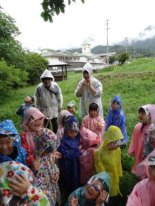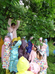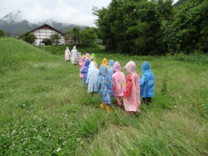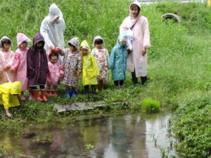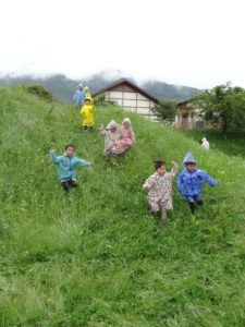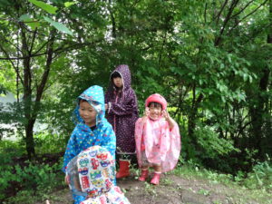 雨降りの日はどんな遊びができるのか、こどもたちと楽しい、ワクワクできる体験をしたいと思って計画しました。カッパを着て遊びに行ったあおきっこ広場。いっぱい遊んでカッパは泥んこになりましたが、みんなとってもいい顔になっていました。「こんな楽しい遊びができて、青木っていいなぁ」と改めて思いました。