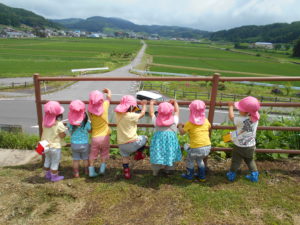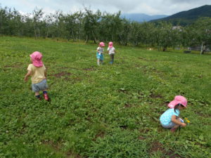 散歩を継続していると、「あっ、イチゴ赤くなった。」「りんご、大きくなった。」などの声がたくさん聞こえてきました。花から実、実の色づきなど、日ごとに変化していく畑の野菜や果物に気付いたり、以前は「ちっちゃい。」と言っていた赤ちゃんバッタが「大きくなったね。」になったりと様々なことへの興味が広がり、言葉のやり取りも増えてきています。