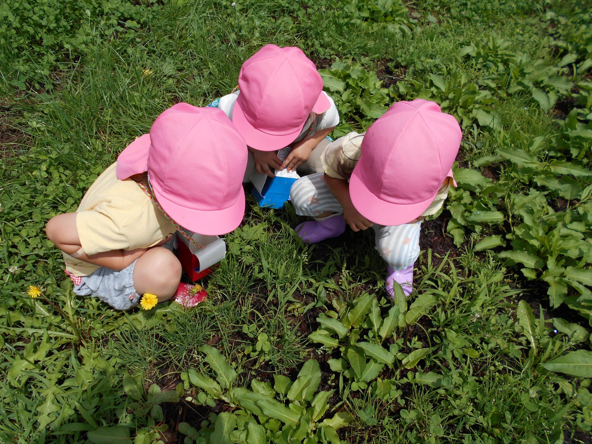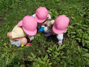 草花を「おみやげにするー。」と言って摘んだり、「ちょうちょだー!」と追いかけたりオオバコ相撲をしたりと楽しんでいます。