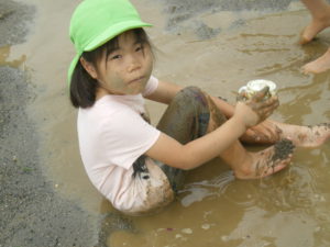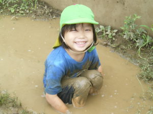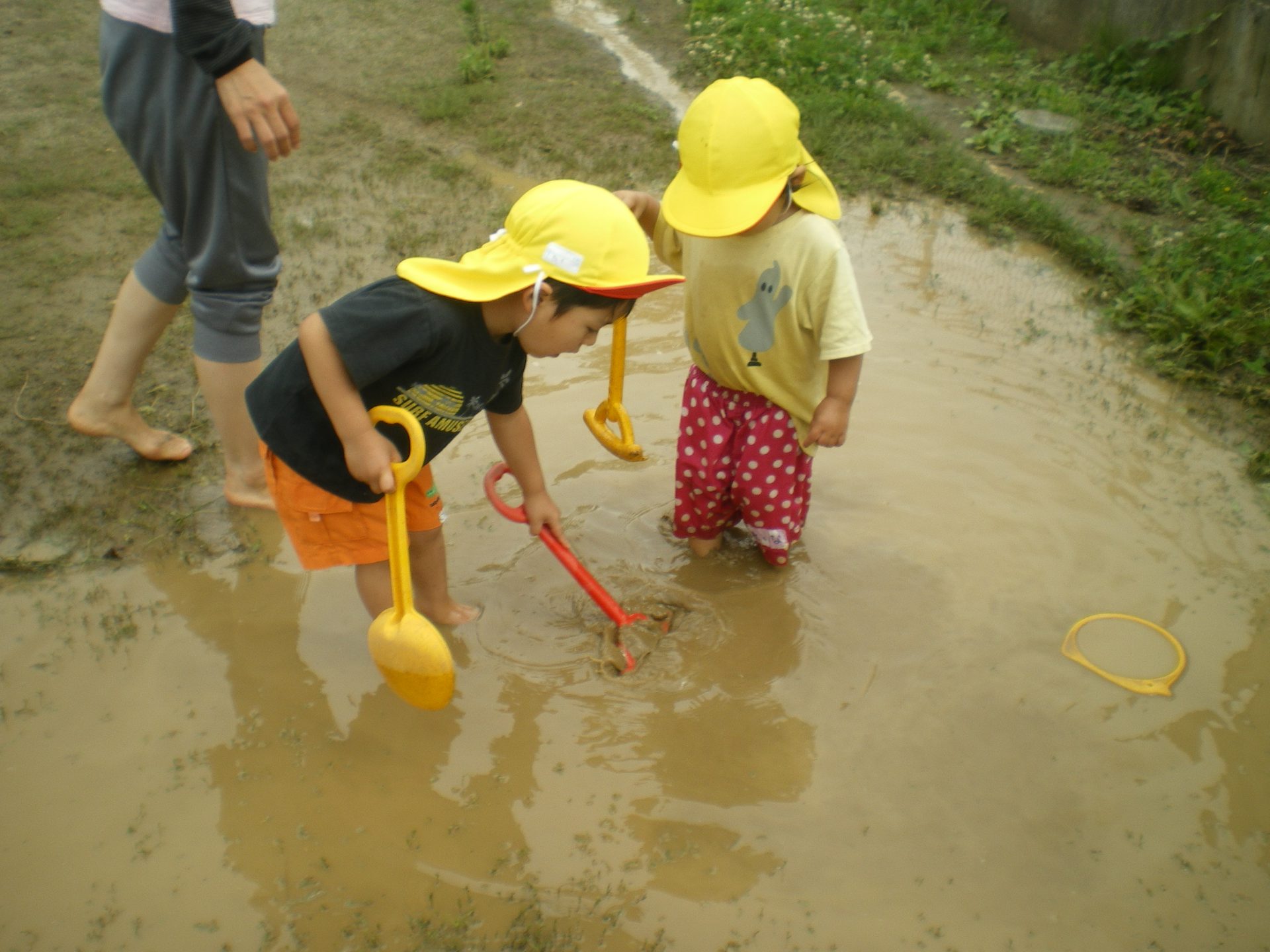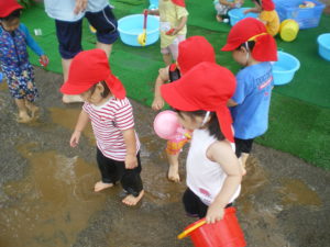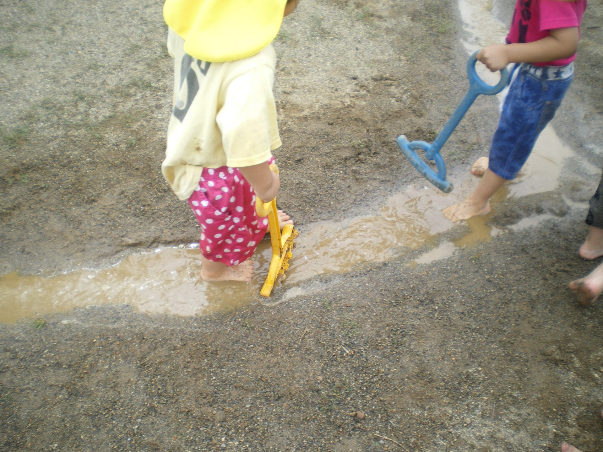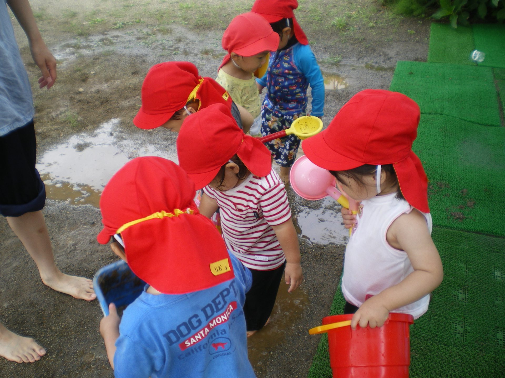 未満児の庭で水遊びをした後、たらいの水を流したら、水たまりができたのを早速見つけてバチャバチャ足を入れ始めました。「やっぱり水より泥んこ」ですね。泥んこ遊びは年齢を問わず魅力がありますね。来年は大きい庭でもっと大胆に遊ぶことでしょう。