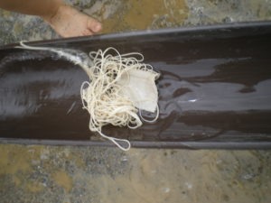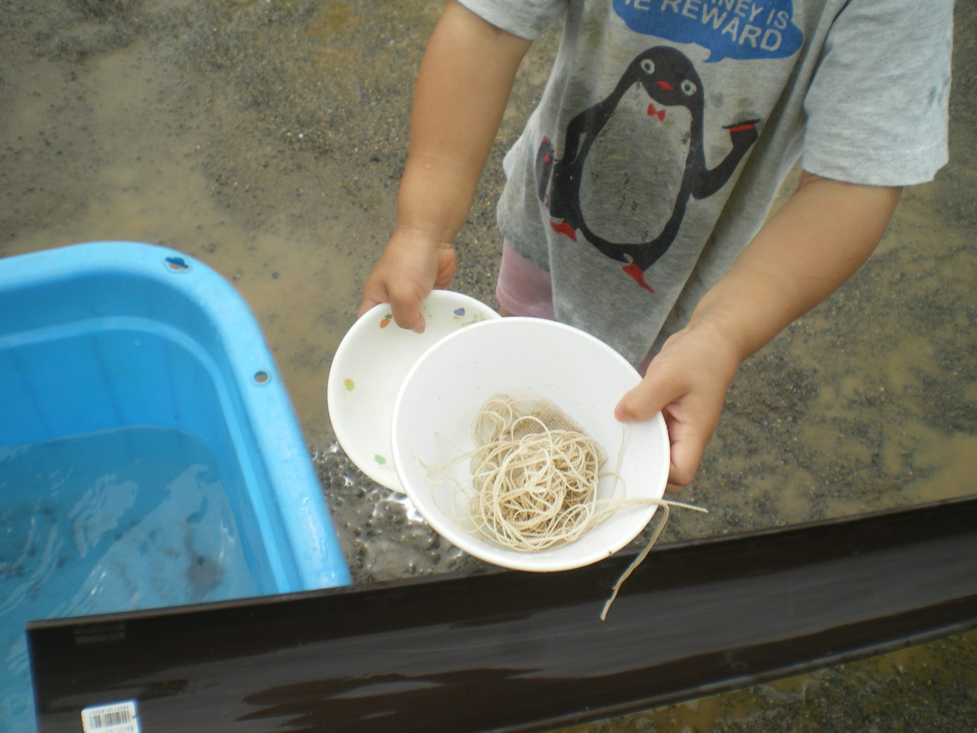 「ほら、そうめん流しをするんだよ」あっという間に流れてしまい、なかなすくえず笑ってしまいます。このそうめんはタコ糸です。子どもたちのアイディアを取り入れました。