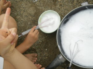 お母さんがやるように泡立て器で石鹸クリームを作っています。