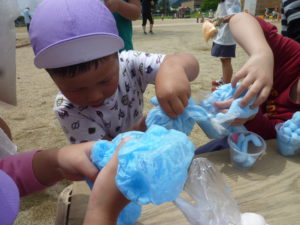 石鹸と水を合わせて、自分たちで作るシェイク遊びを取り入れてみました。