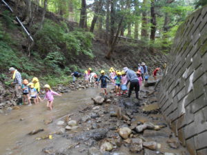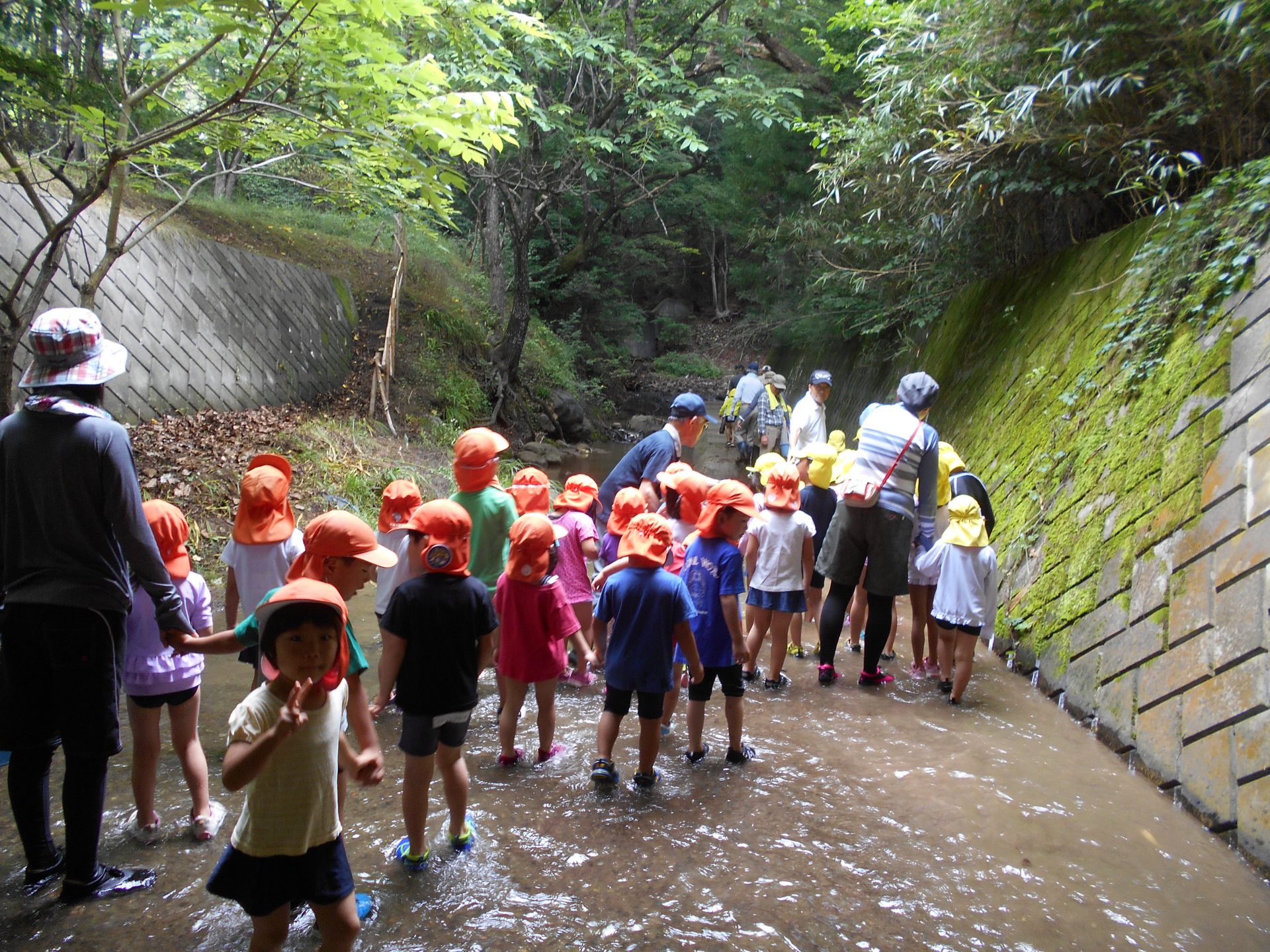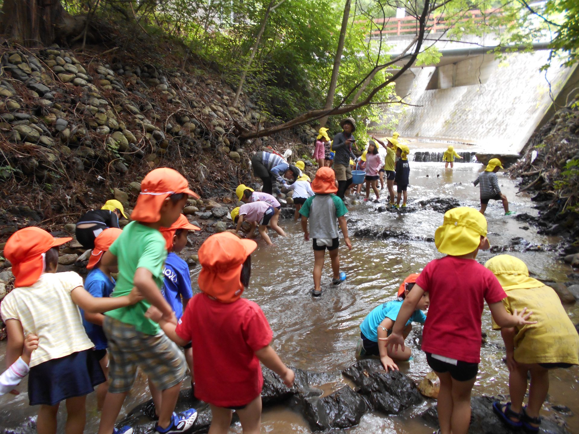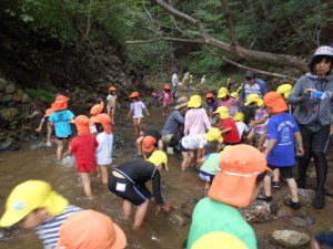 ・身近な川に入り、沢ガニを見つけ、夏の自然に触れた遊びを楽しむ。(年中)
