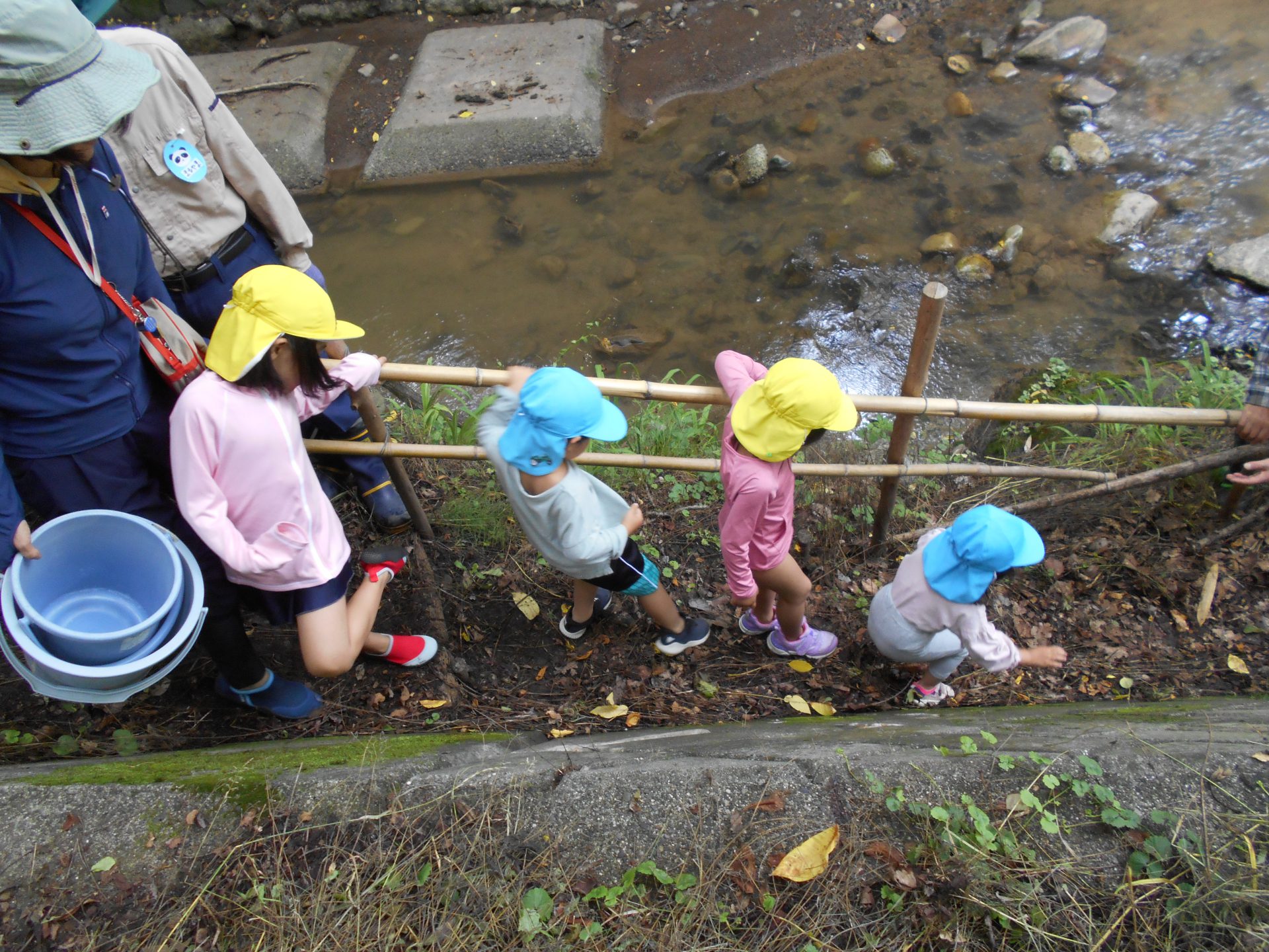 地区の老人クラブ「万年青会」のみなさんとの交流で沢ガニ捕りへ行きます。沢に下る坂に万年青会の方々が手すりを設置して頂きました。手すりがあるため子ども達も安全に下ることができます。子ども達のために配慮してくれたお気持ちに感謝です。