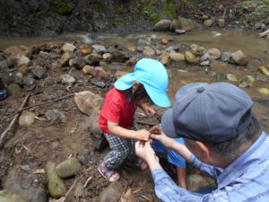 年少の女の子に沢ガニをあげる万年青会の方、勇気を出して触ります。「おじいちゃんありがとう。」