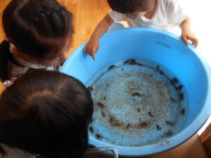 小さいお友だちも楽しみに待っています。飼育の方法もみんなで調べて大切に飼育します。