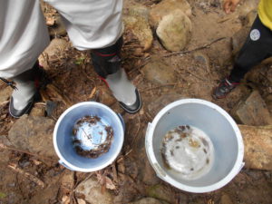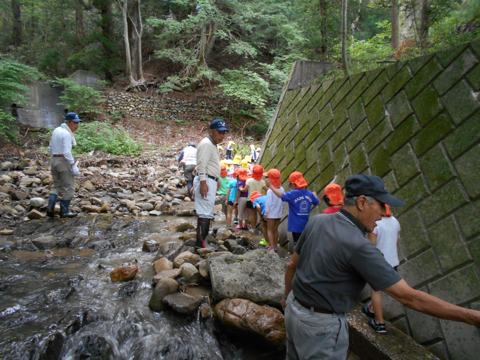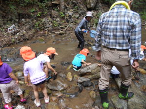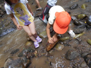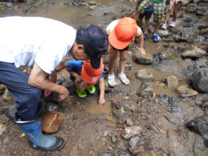 子ども達は、石を動かし探します。発見した時は「キャーキャー」大騒ぎ、ここでしか体験できない素晴らしい時間を過ごします。沢ガニを捕まえた時の満足感は最高です。