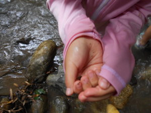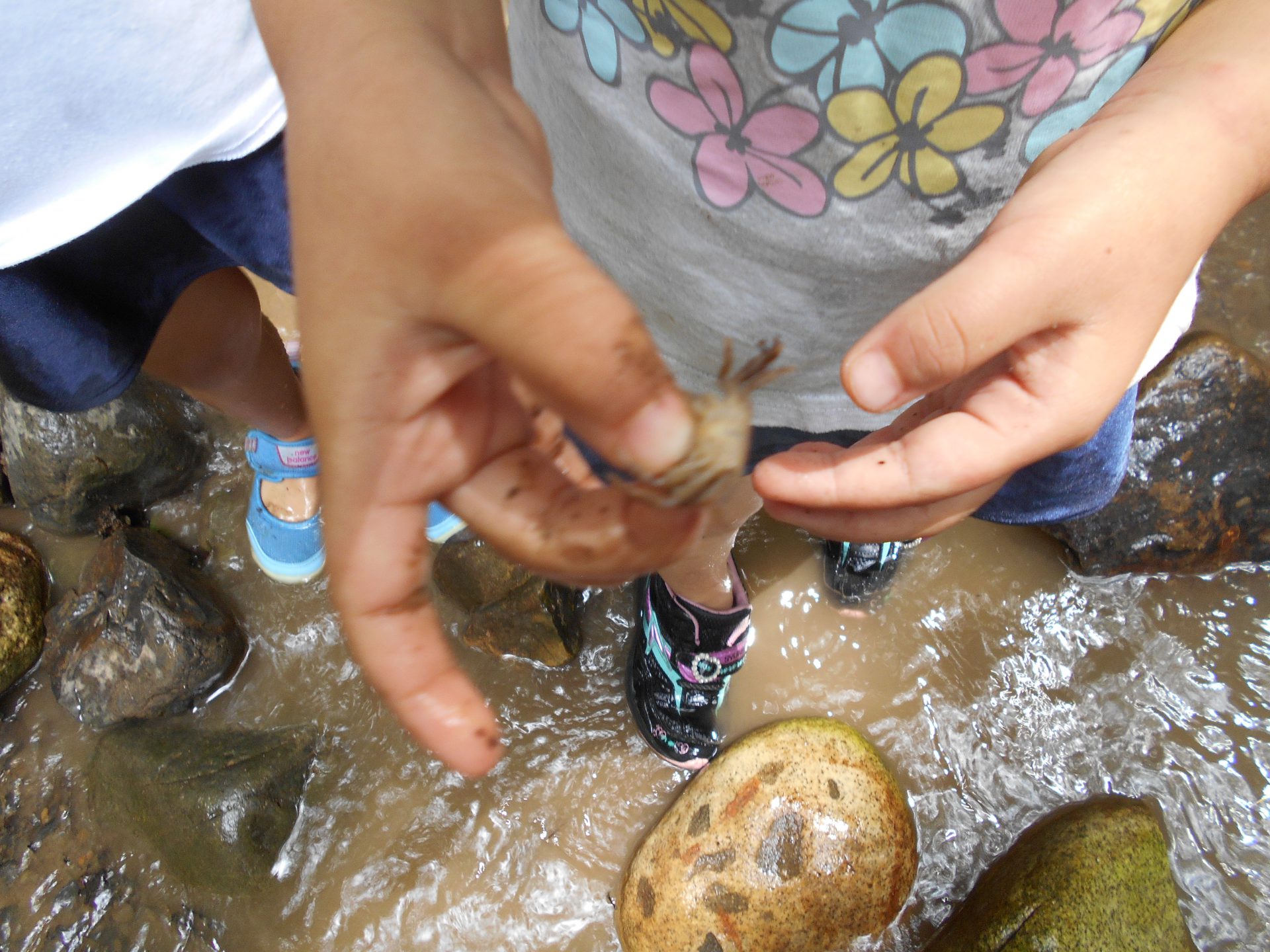 なかなか沢ガニに触れられない年中さんの男の子、頑張って掴もうと悪戦苦闘中!!捕まえられた時は大喜び!!自分に自信がついた瞬間です。