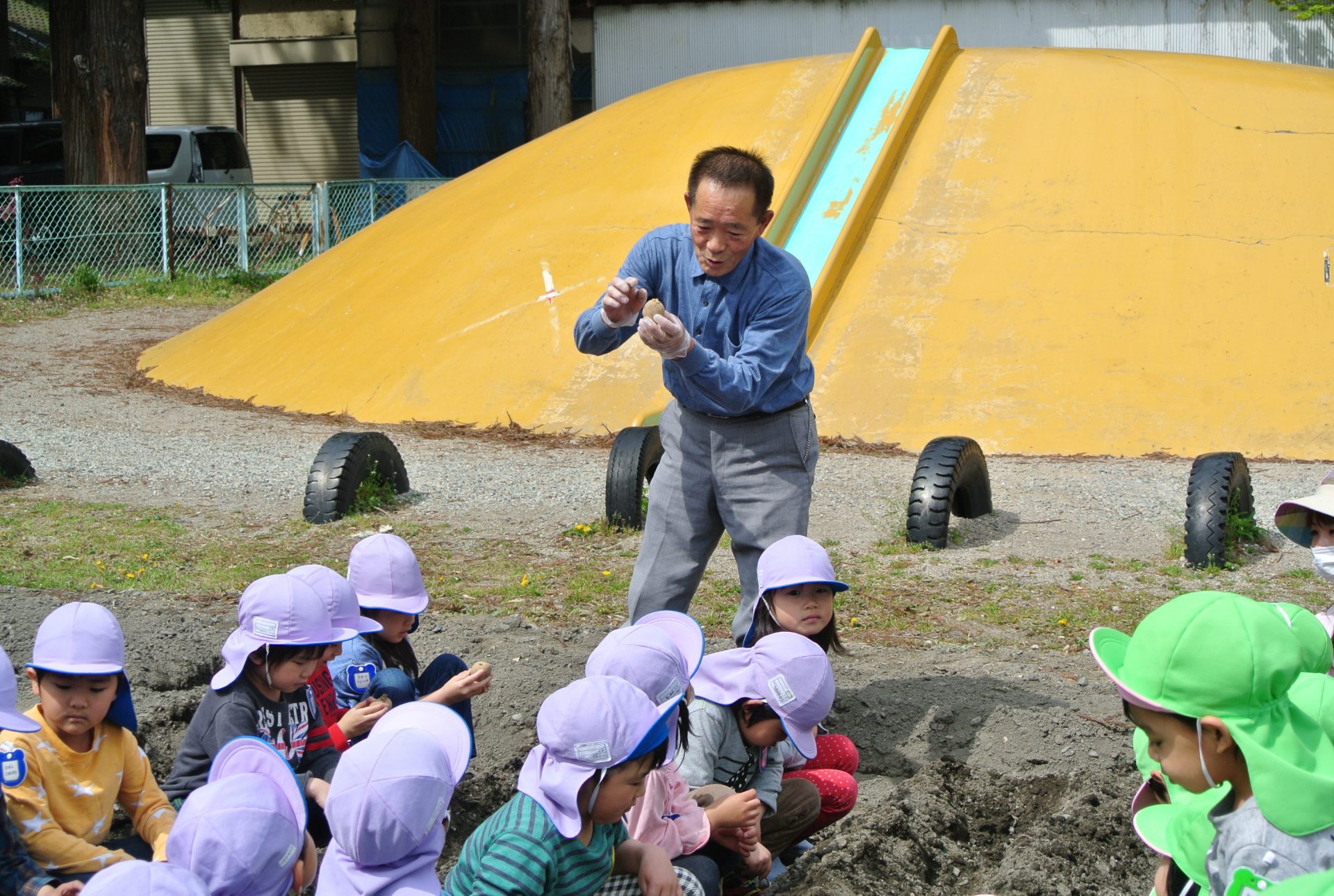 おじいちゃん先生からじゃがいもの種の植え方を教えてもらいました。「ここの芽から大きくなるんだよ!」真剣に聞いています。