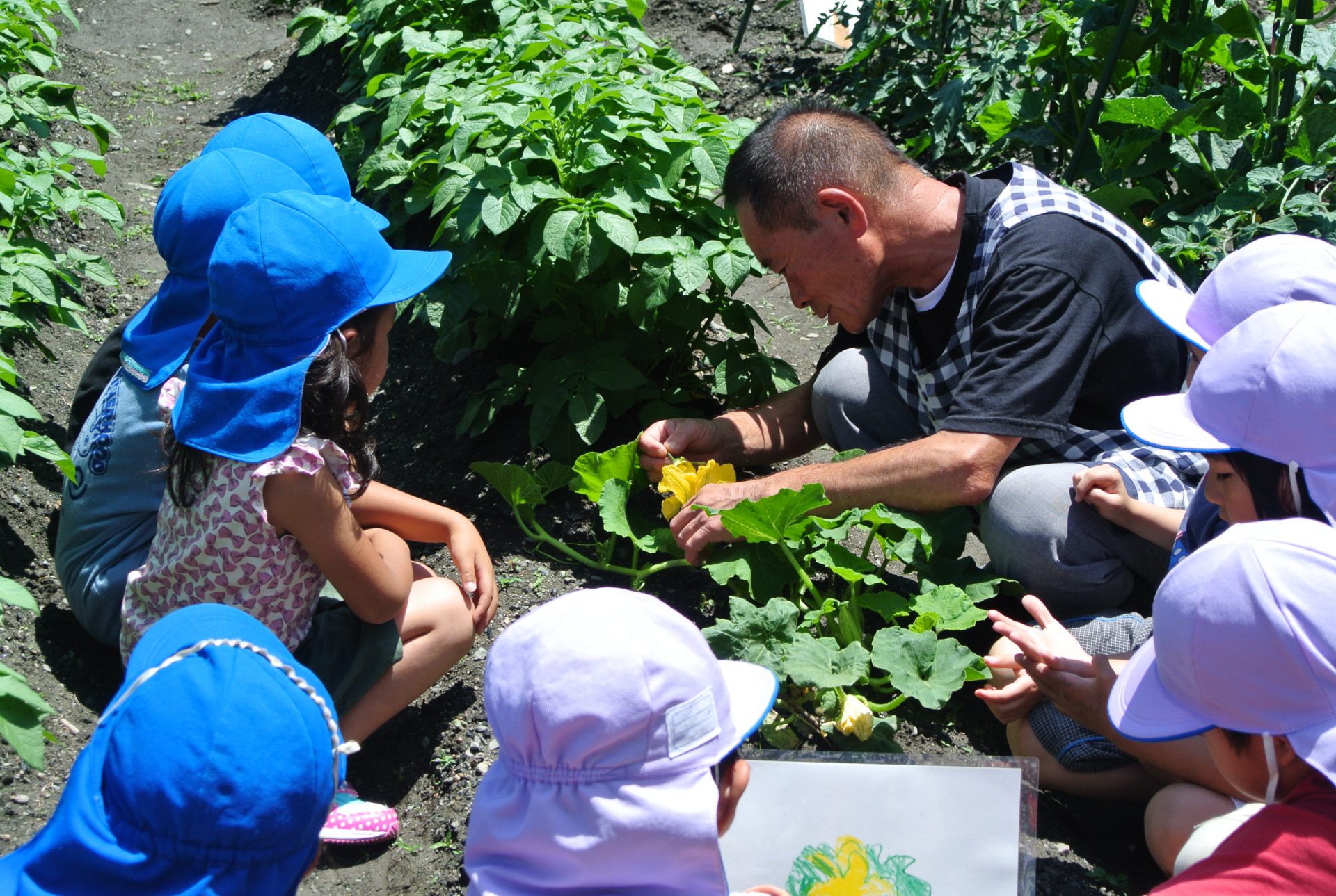 かぼちゃの花には雄花と雌花があるんだね。おじいちゃん先生が受粉を教えてくれました。