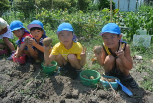 「あった~」「見て!こんなにいっぱい」「大きいよ~」など暑さも忘れ一生懸命おいも掘り、大きなおいもに笑顔がいっぱい!
