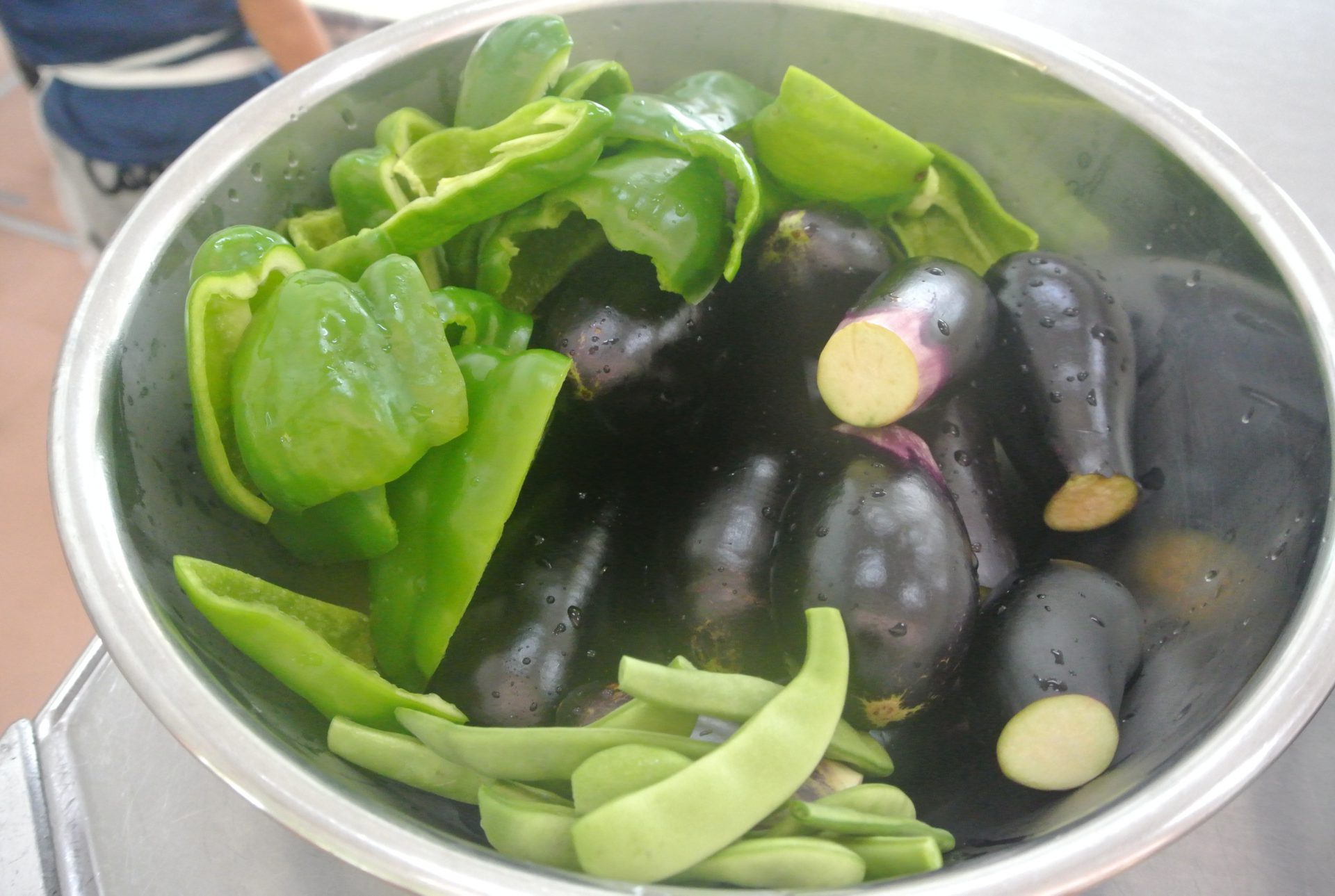 年中さんはピーマン、ナス、さやいんげんを切ったよ!。