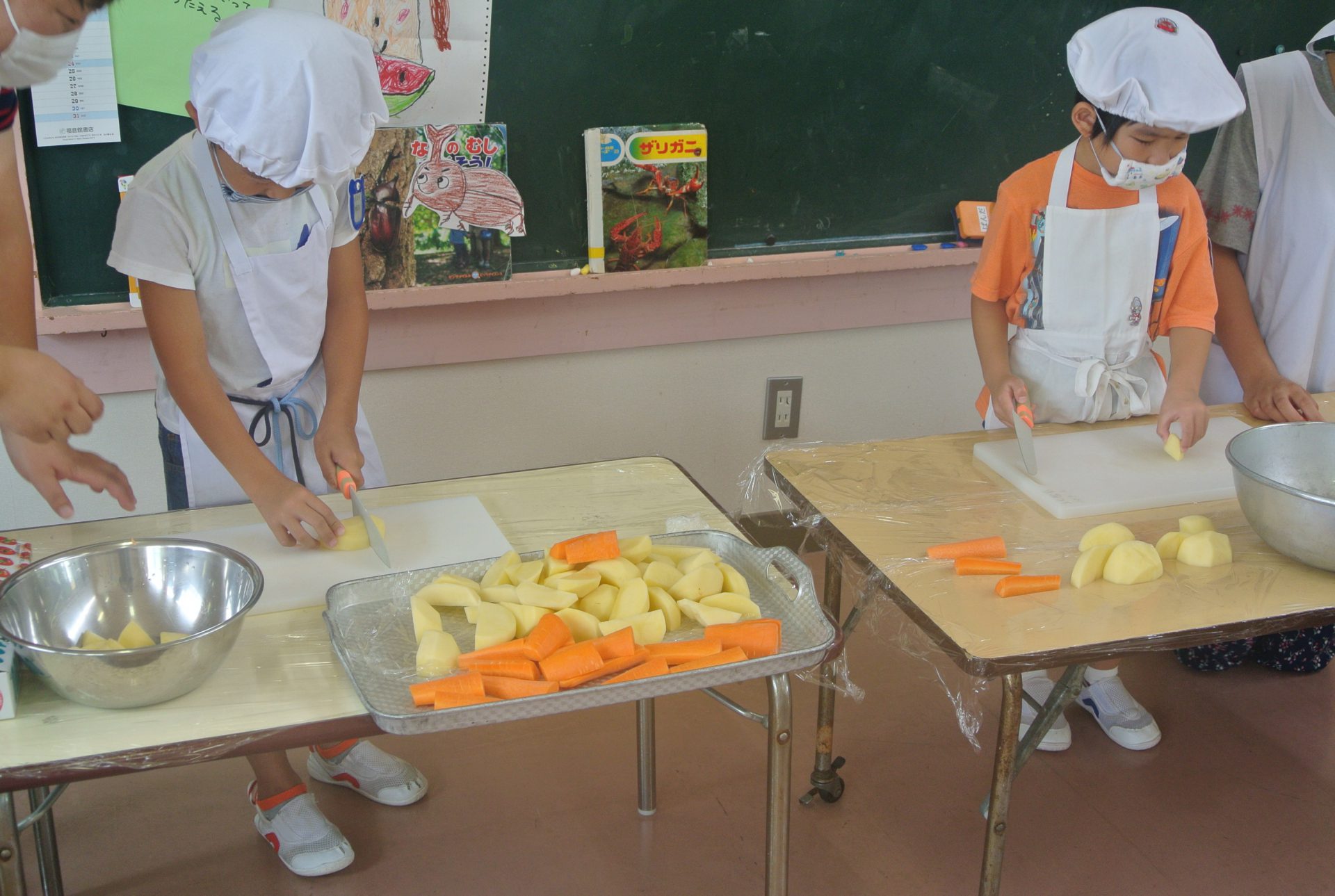 年長さんはじゃがいもとにんじんを包丁で切ったよ!形がそろってなかなか上手です。