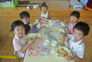 遊戯室に集まり《カレーパーティー》たくさん野菜が入ったカレーはおかわりしました。おいしくっておなかいっぱいになったよ!
