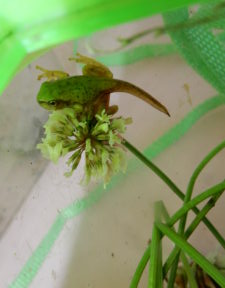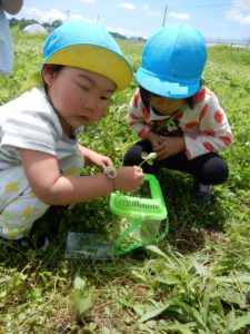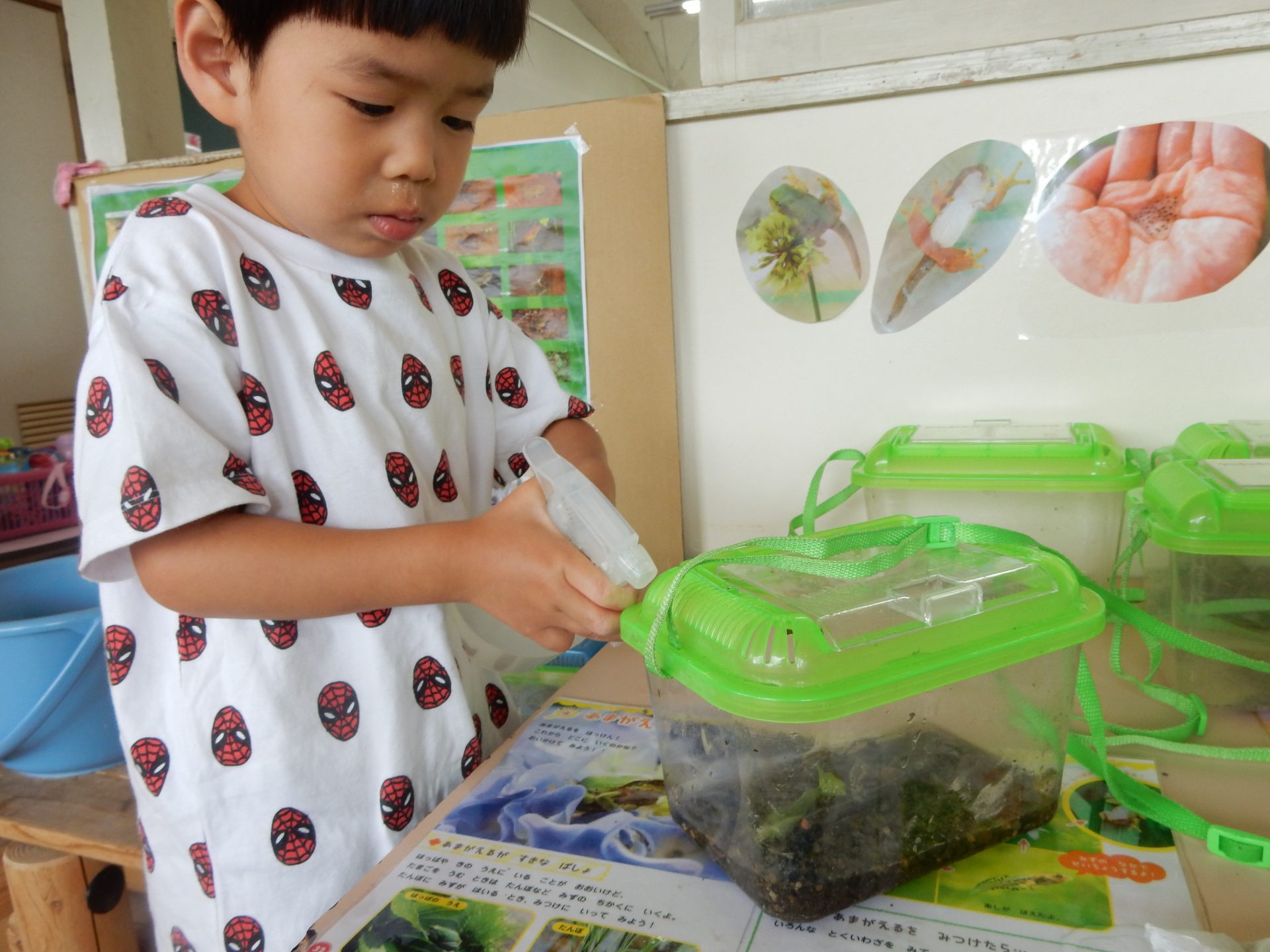 子どもたちは「カエルの赤ちゃんだ!」と優しくケースに入れ、葉っぱを入れたり花を入れたり大切にしていました。