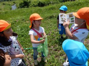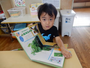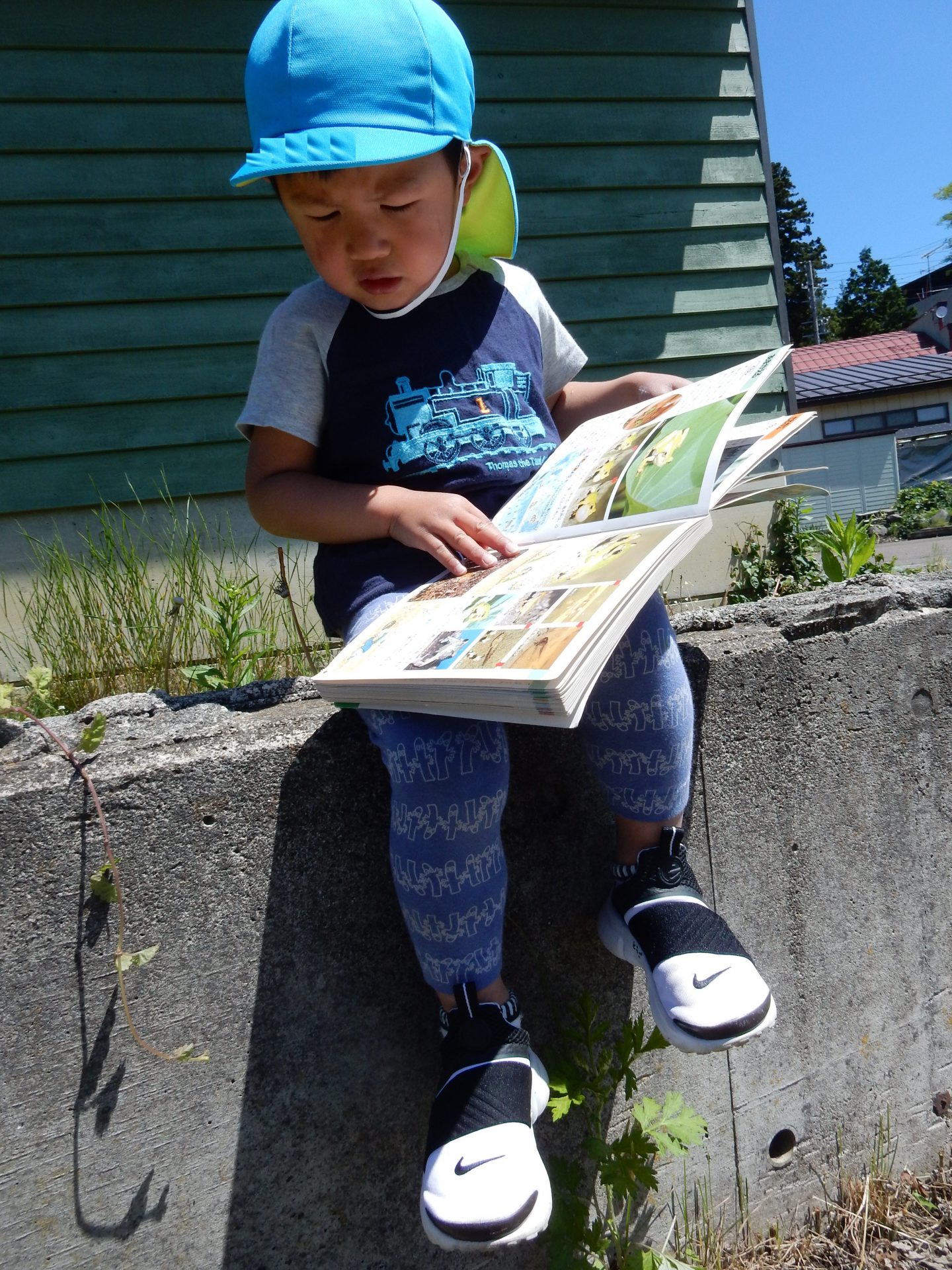 「カエルは葉っぱのあるところにいるんだって!」と外に図鑑を持って行って、カエルのいそうな場所を調べているお友だち。