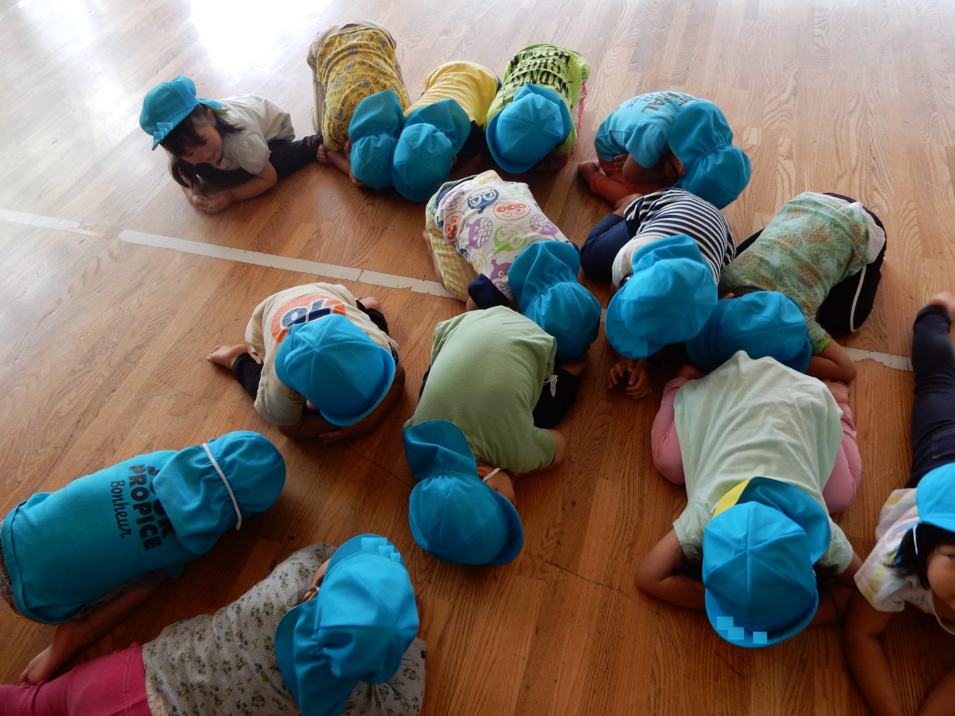 「カエルの赤ちゃんは最初卵だったんだよね」と卵に変身!「丸い形だったよ。」と体を丸めてじーっとしています。