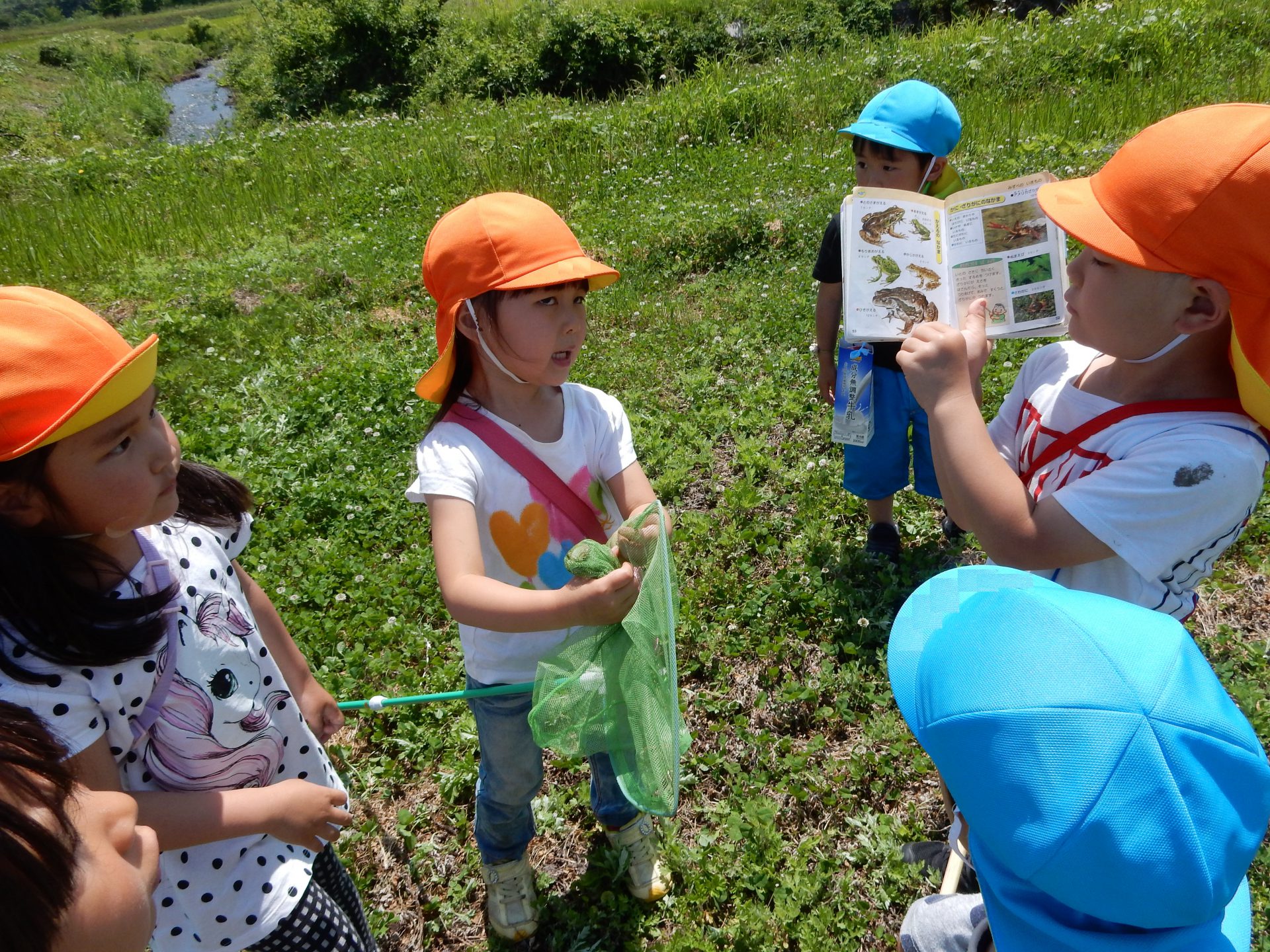 大好きなカエルをたくさん見つけたい子どもたち。図鑑や本で調べて、疑問を持ったり、それを試しみたり、お友だちや保育士に伝えたり、と自分で考えたり調べることも多くなりました。その時の子どもたちのワクワクした顔、試したり発見した時の嬉しそうな顔、驚いた顔。すぐに答えを教えてしまうのではなく、子どもたちがチャレンジできる環境を作っておくことが大切だなと感じました。