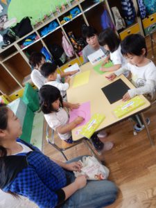 カエルのお家をキレイにしたい‼︎と紙を切ったり貼ったり描いたり…製作遊びにも夢中です。