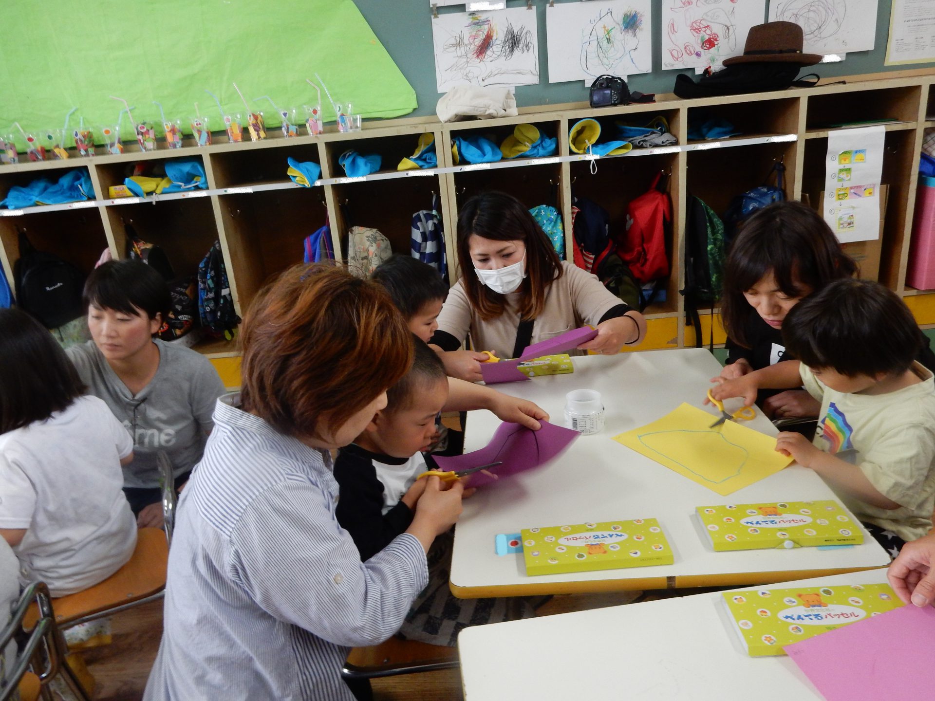 そして、保育参観日に、お家の方とカエルに変身するための変身グッズ、カエルの帽子作りもしました。