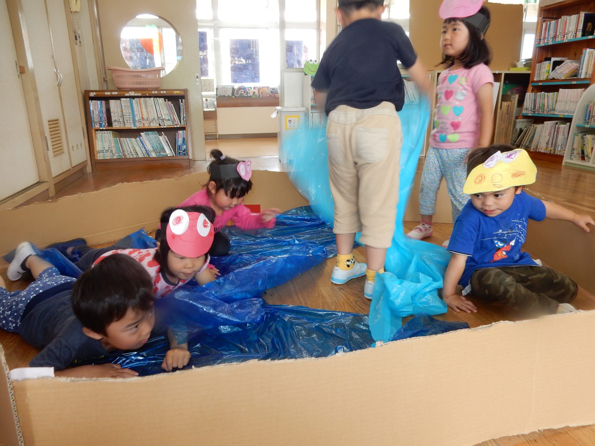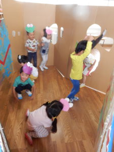 カエルさんの帽子がお気に入りの子どもたちは次の日、カエルのお家で帽子をかぶって遊んだり、トイレに行ったり、給食を食べるときにもかぶったまま…カエルに変身して楽しんでいました。