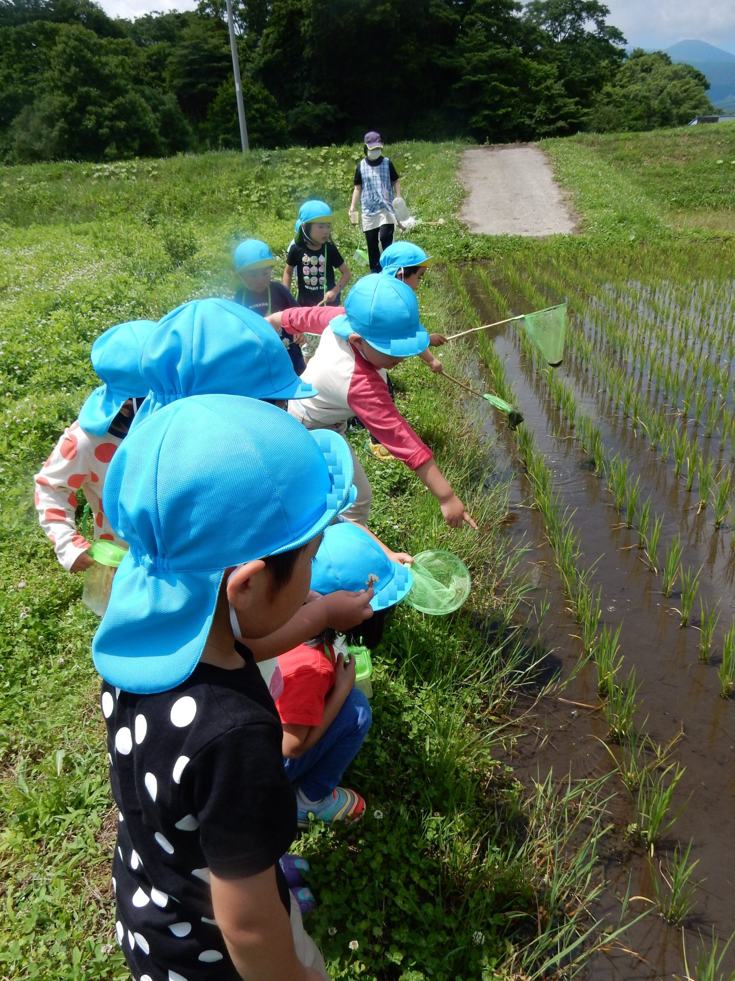 捕まえたカエルをじっくり観察したり、田んぼにいるカエルを見たりしているうちに、「色が違うね。」「大きさも違うよ。」「模様があるね。」などど、色々な種類のカエルがいることに気がつきました。