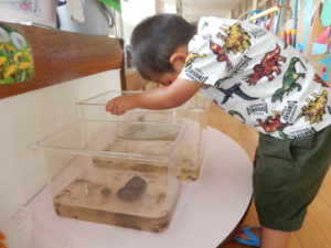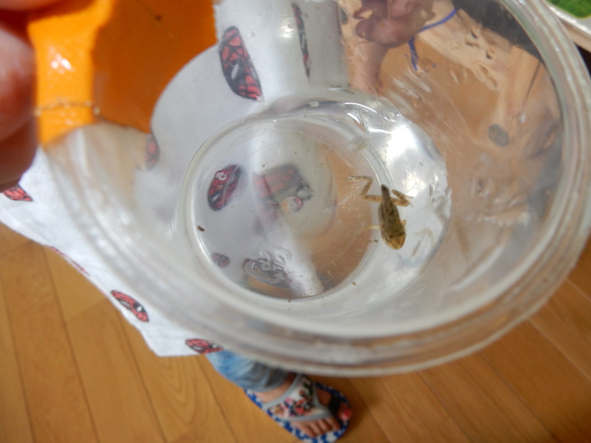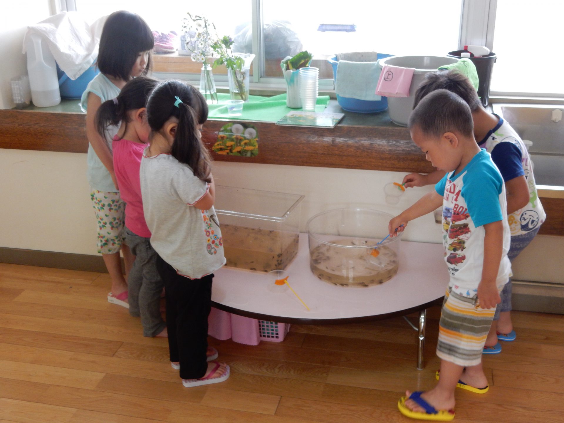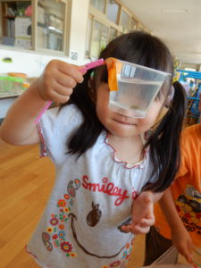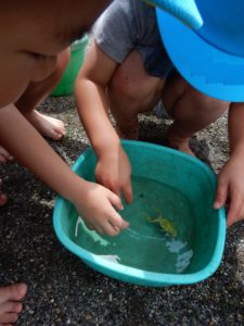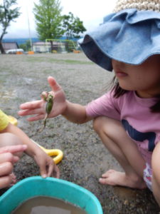 「カエルになったからケースに入れよう。」「少し水もいるかな?」と小さなカエルをケースに入れて観察中です。まだまだたくさんいるおたまじゃくし。カエルになっているのはいないかな??とカップですくっては確認しています。