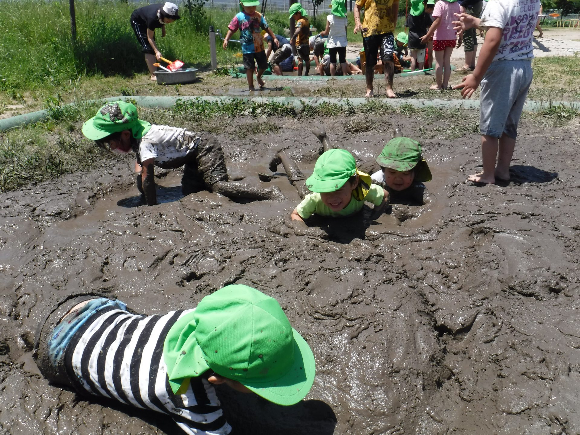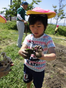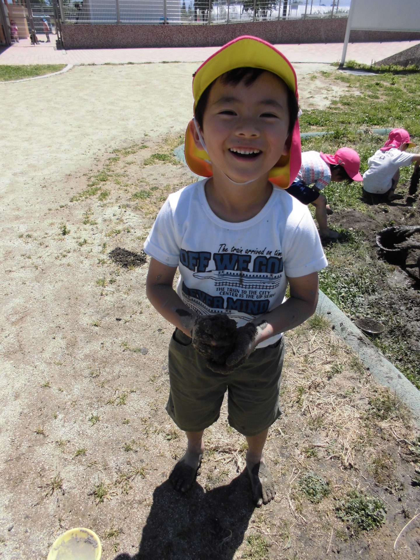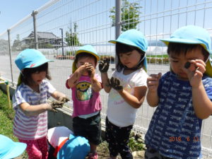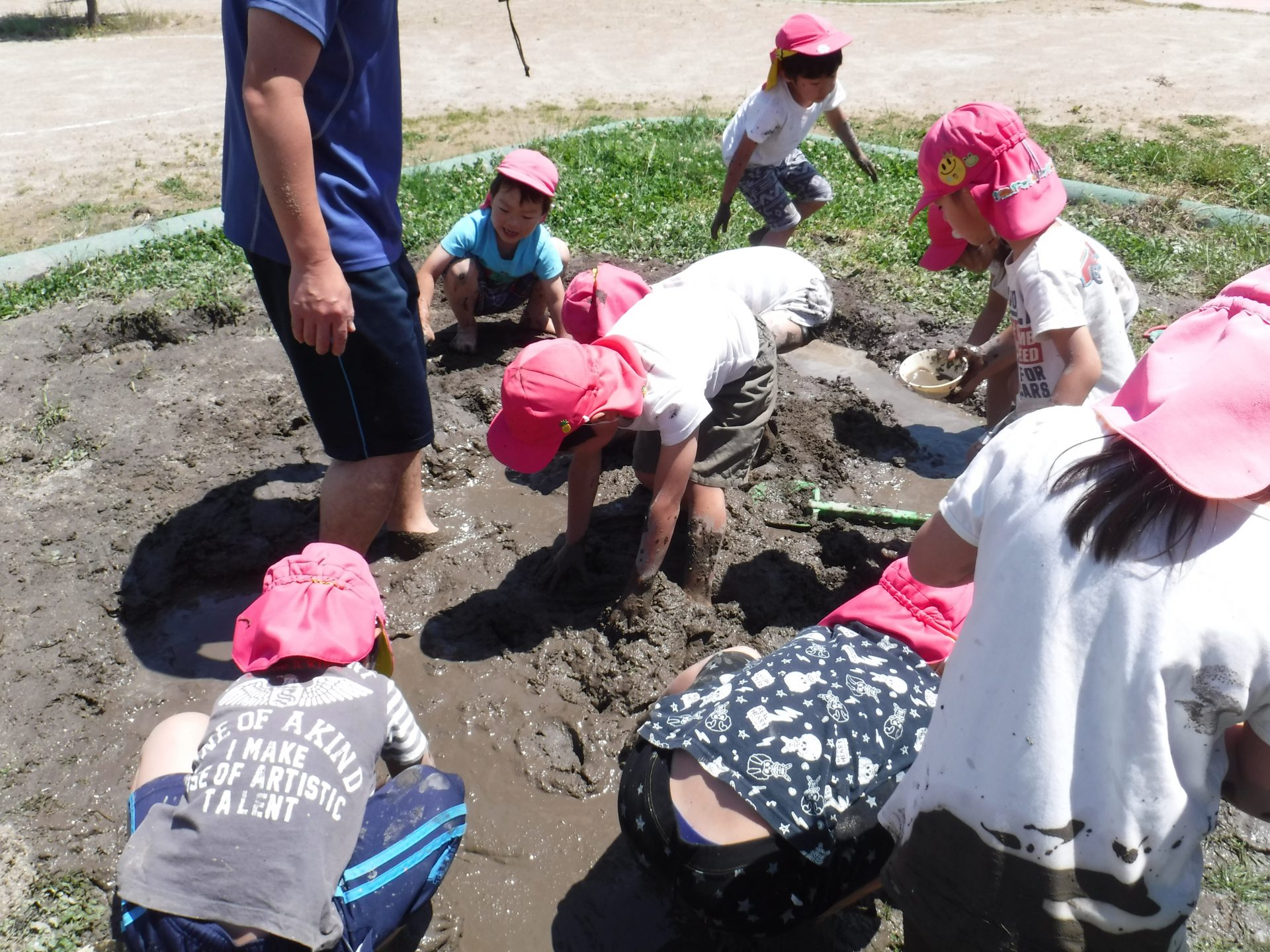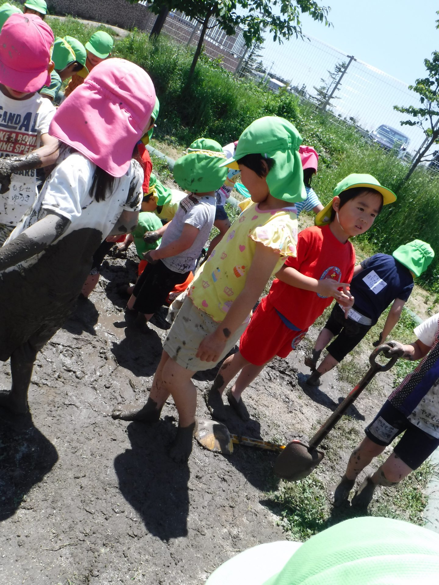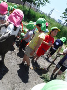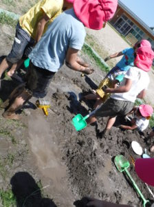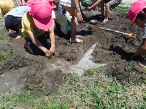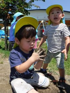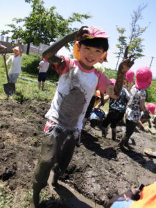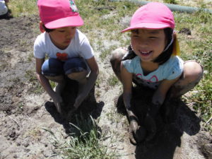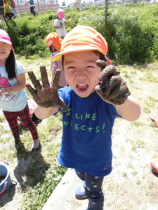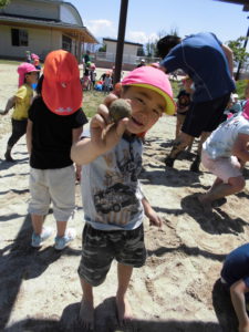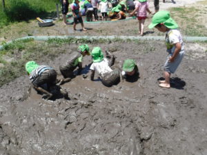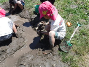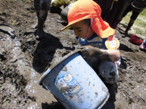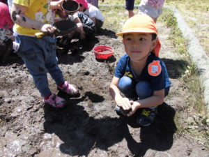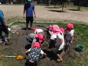 初めは、「いやだ~!」と泥に触れない子もいましたが、