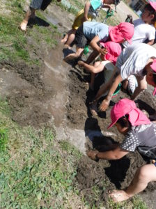 子ども達同士で話し合いながら大きな川を作りました。水が流れると大歓声!!!