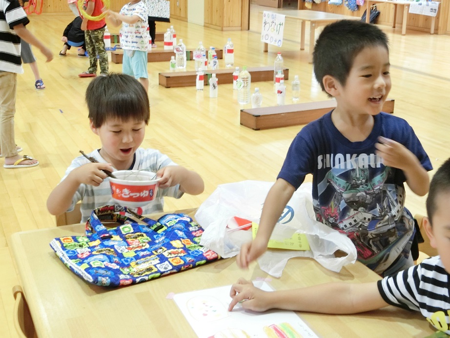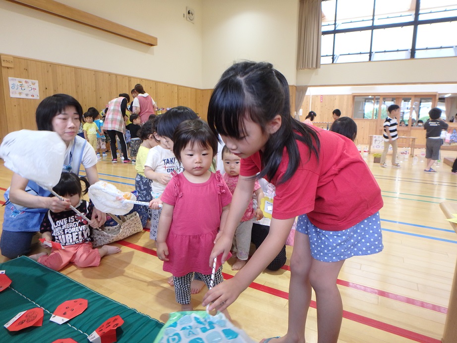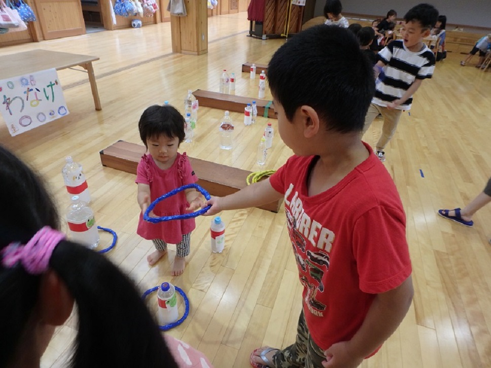 2歳児も年長児に見守られながら輪投げに挑戦!