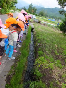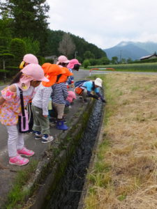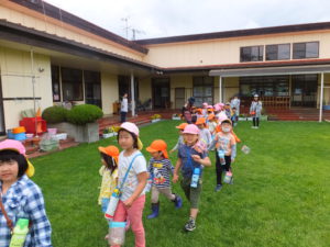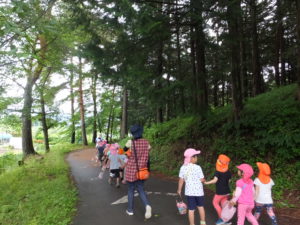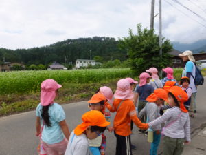 6月のある日、近くにある室山のふもとに木イチゴがあるという話を聞き、年少、年中、年長さんの異年齢で室山へ散歩に出掛けることにしました。