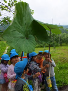 「すごい!重ーい」「これ食べられるんだって」「雨降ったらこれ使おう」