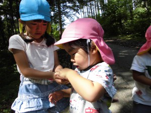年中さんと未満児さんで手をつなぎ、お散歩へ出発です!