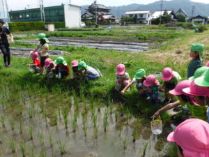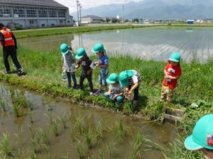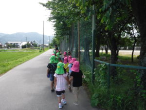 年長さんが お散歩に出かけるから「一緒に行こうよ!」と誘ってくれ 年中さんは 年長さんに手をつないでもらって みんなで近くの小学校の田んぼまで出かけました。