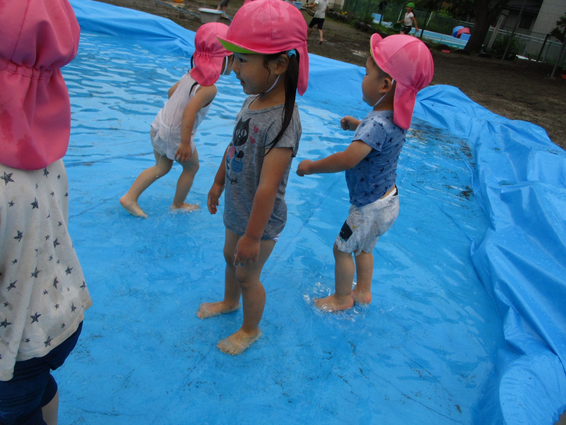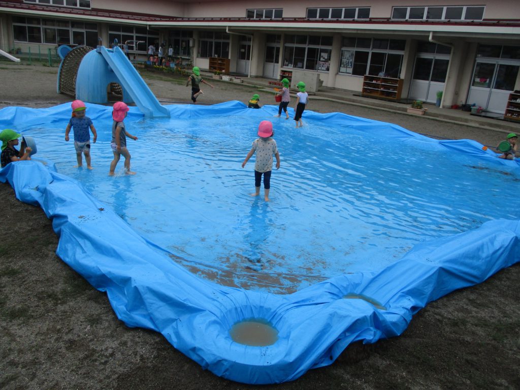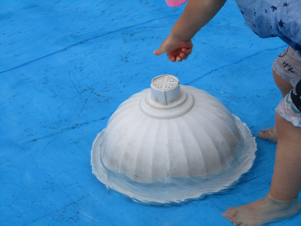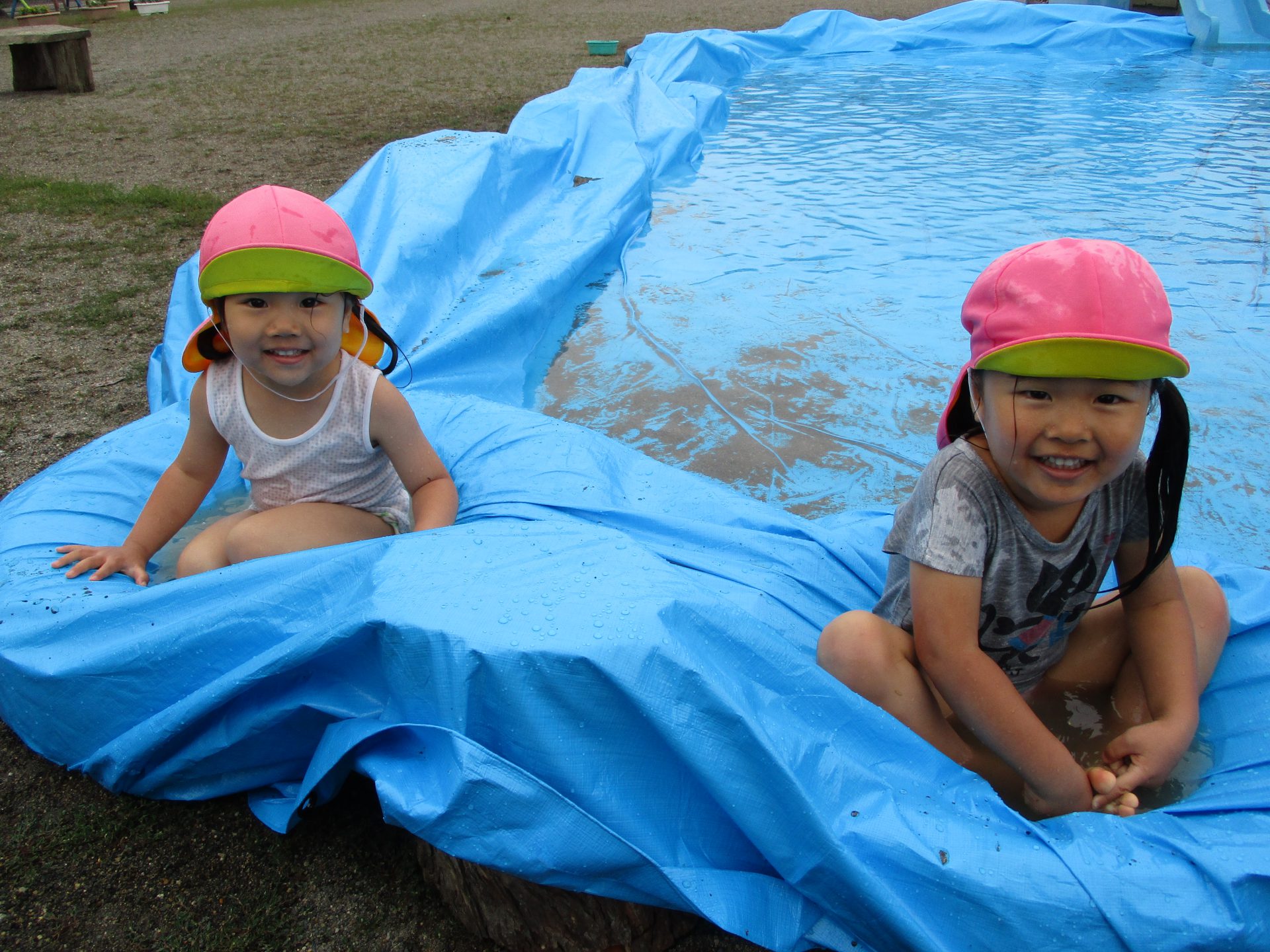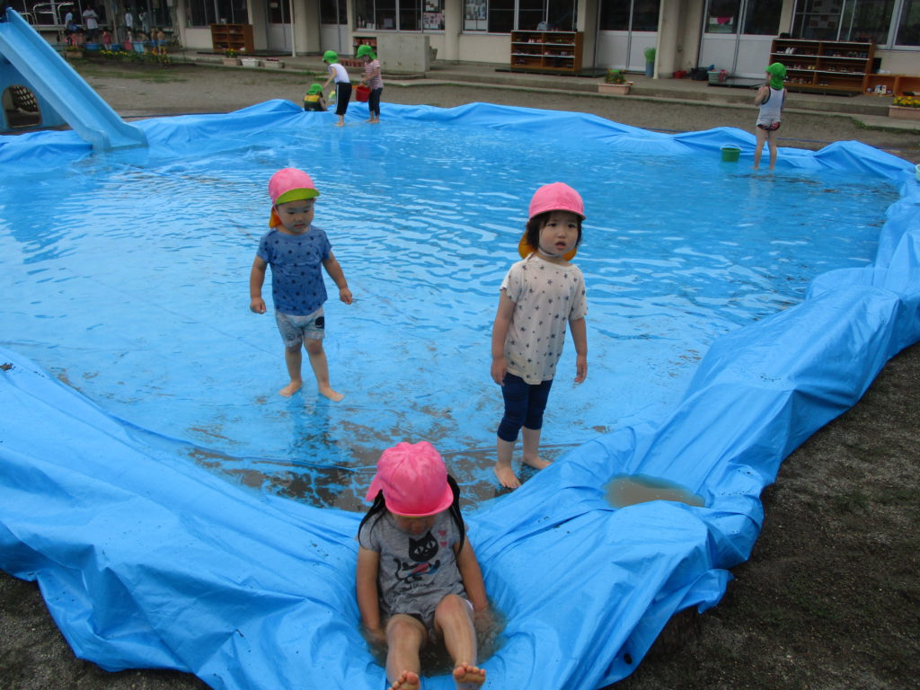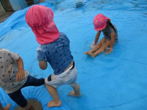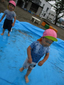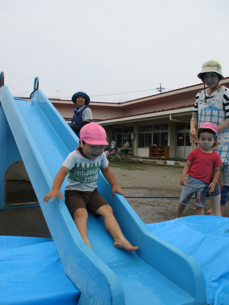 その後は滑り台の下に広がるブルーシートの水の中で楽しみました。