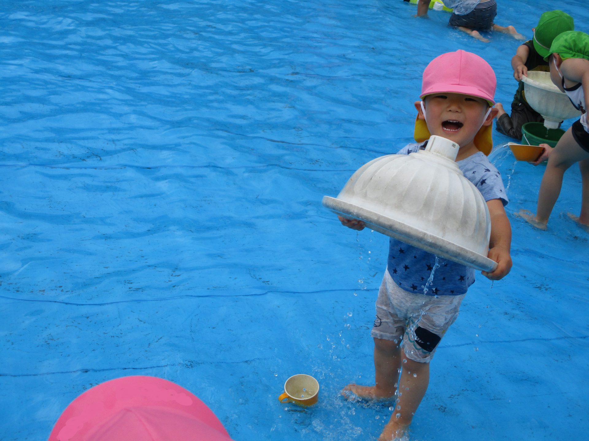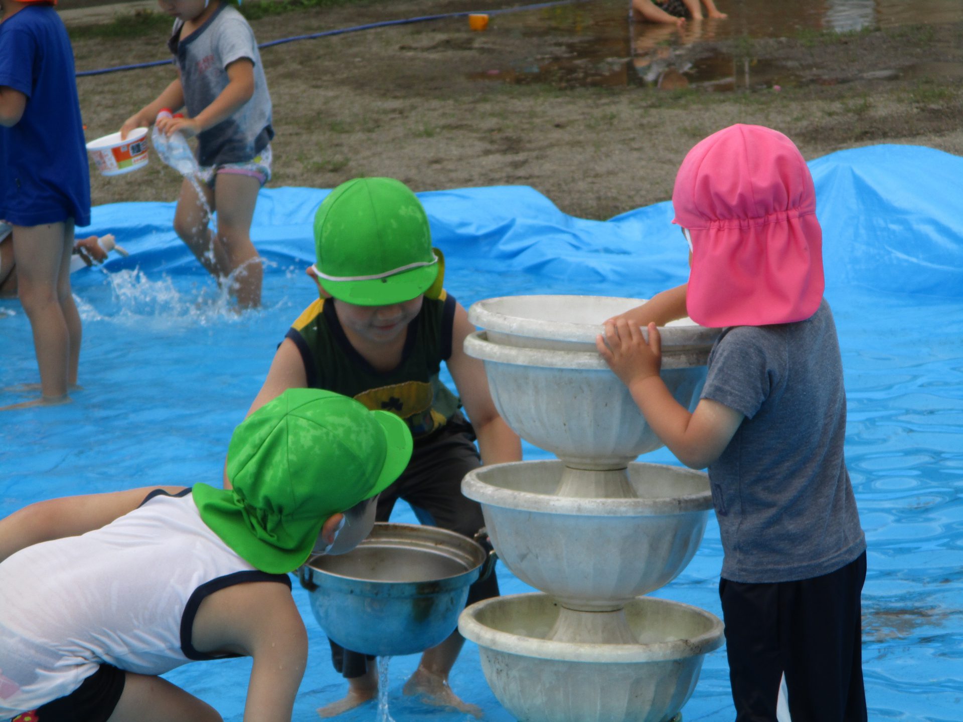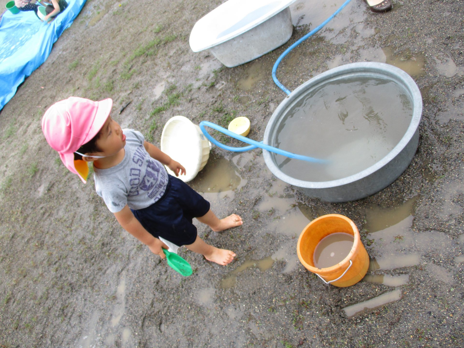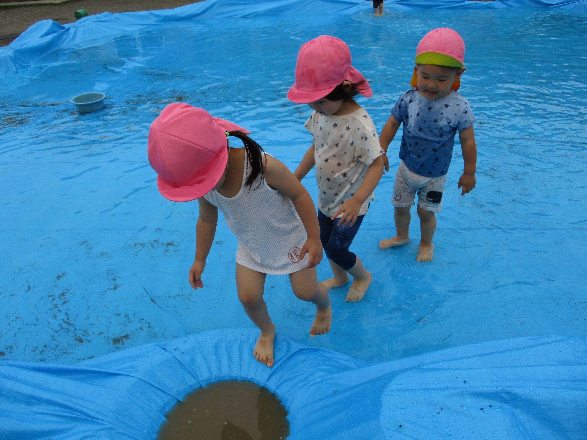 その後は滑り台の下に広がるブルーシートの水の中で楽しみました。