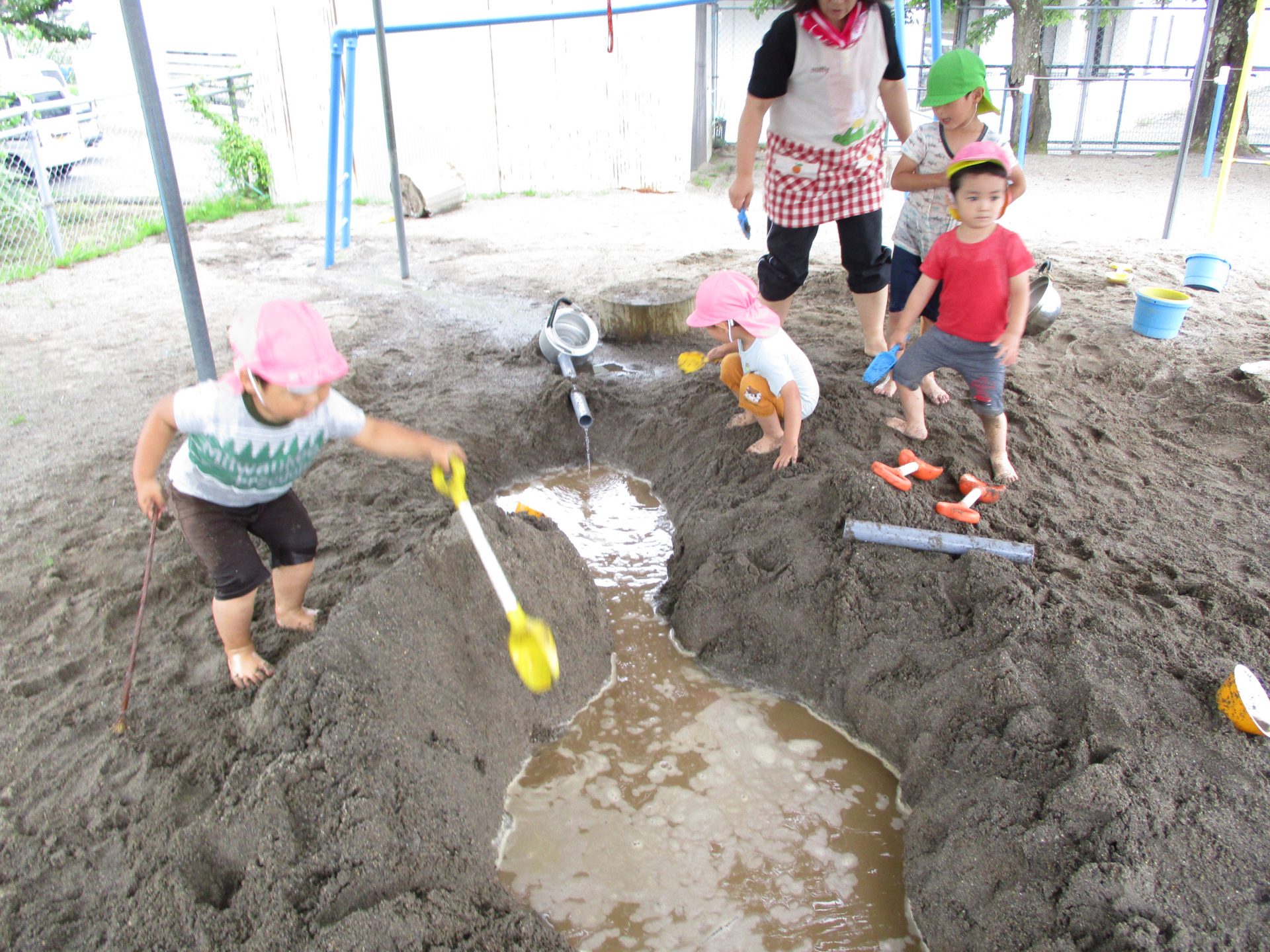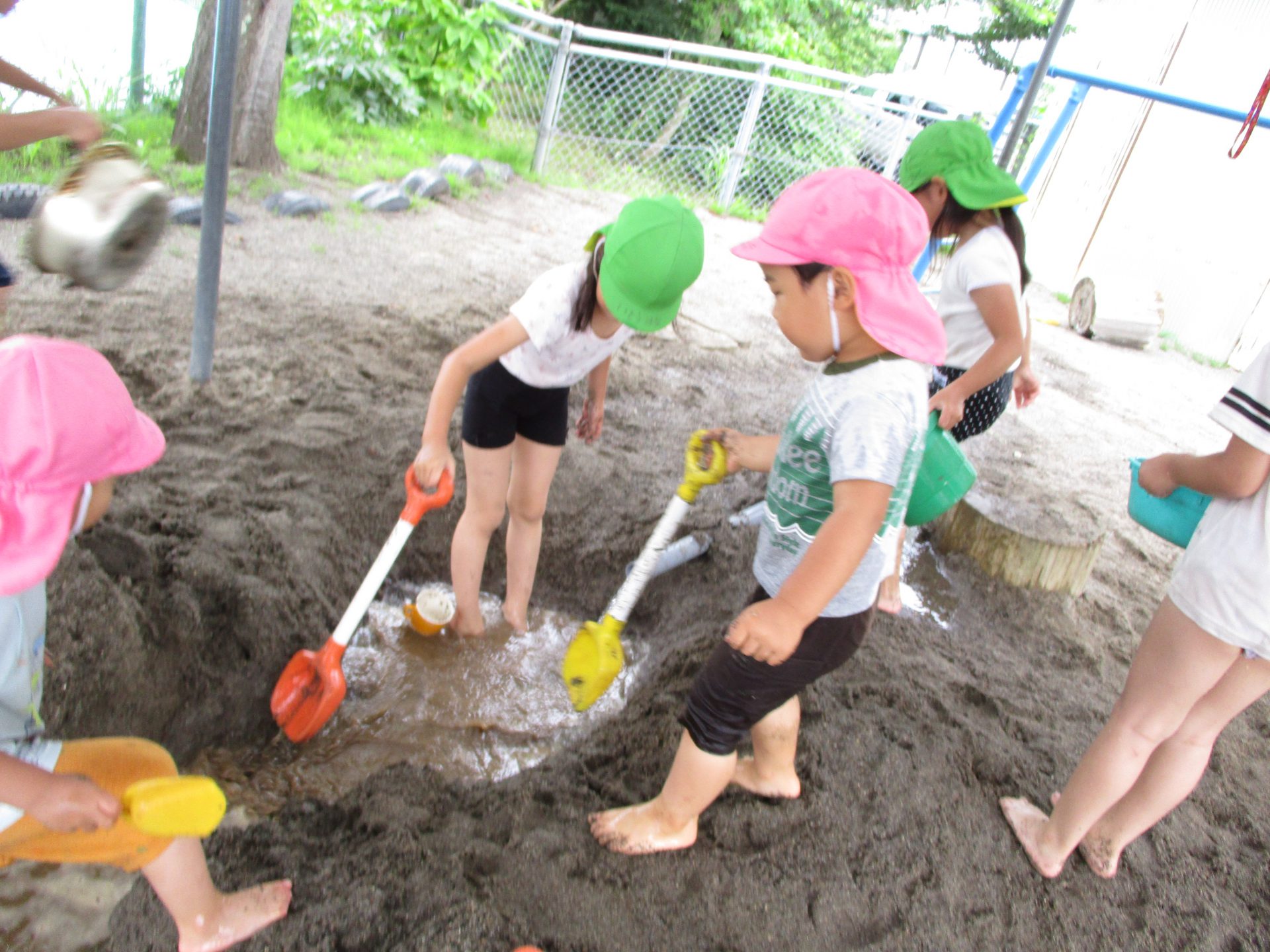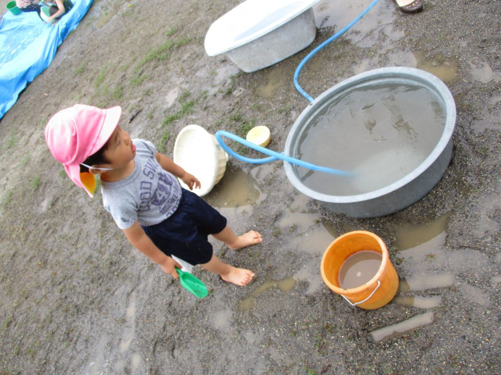 子ども達の周りには、水、砂、泥など、自然の教材がいっぱいです。