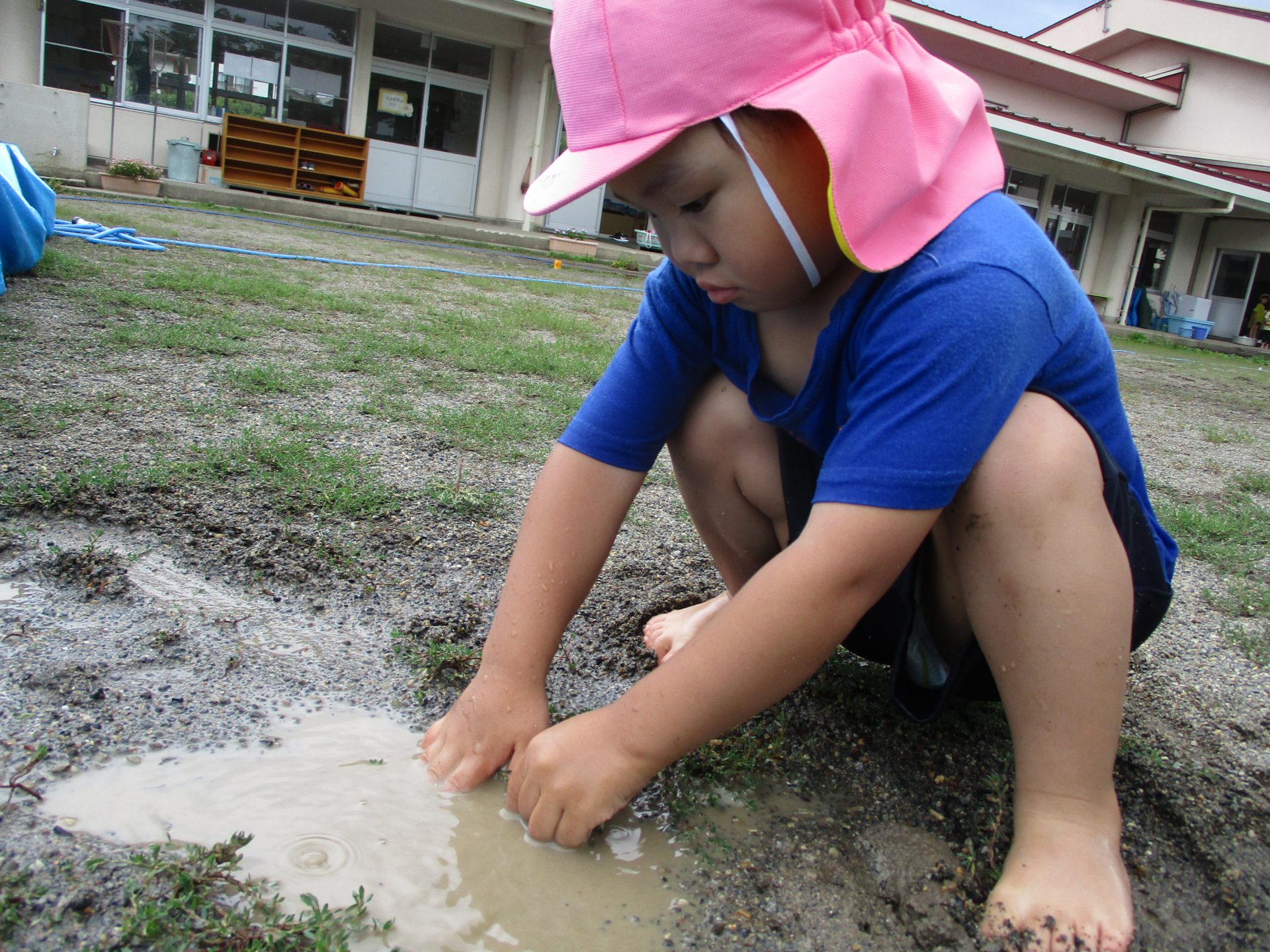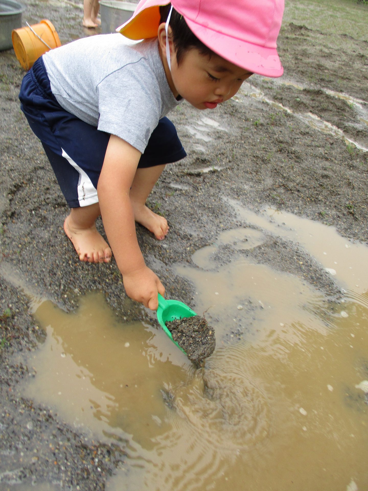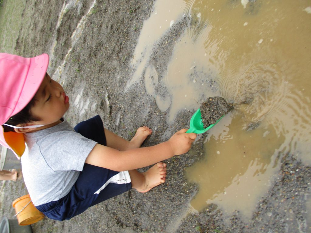 さて、こちらでは水たまりに興味を示した子が、黙々と泥をすくっていました。