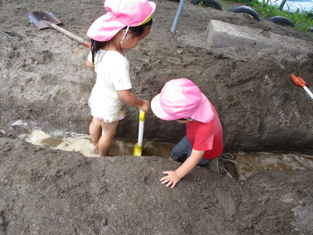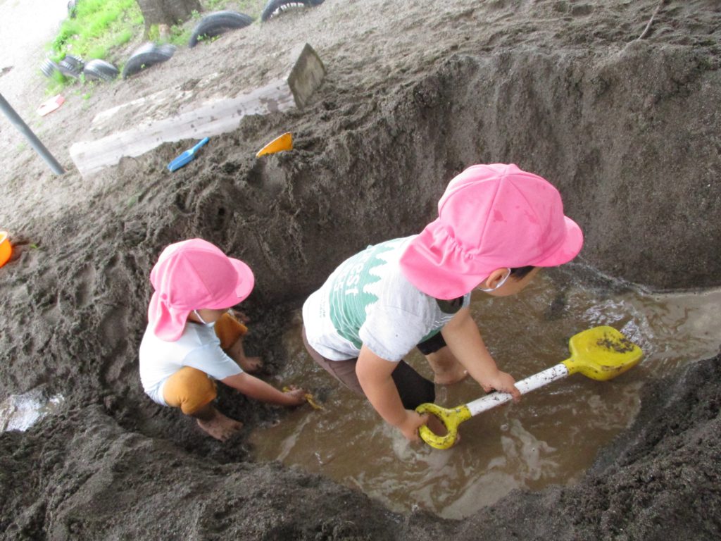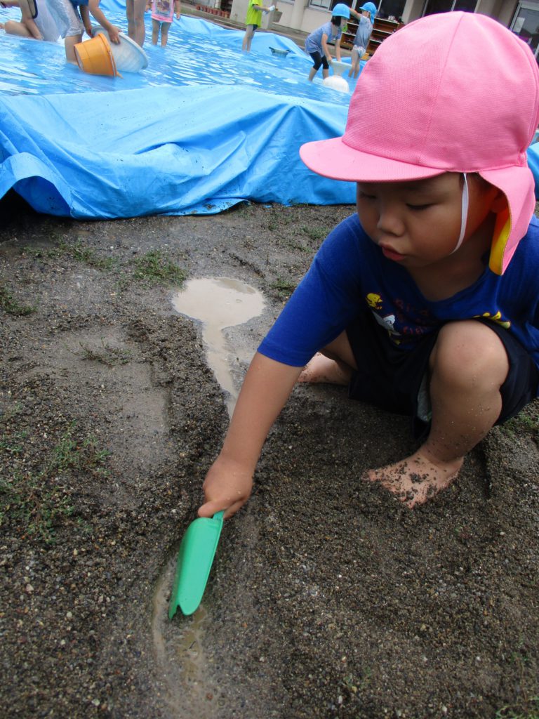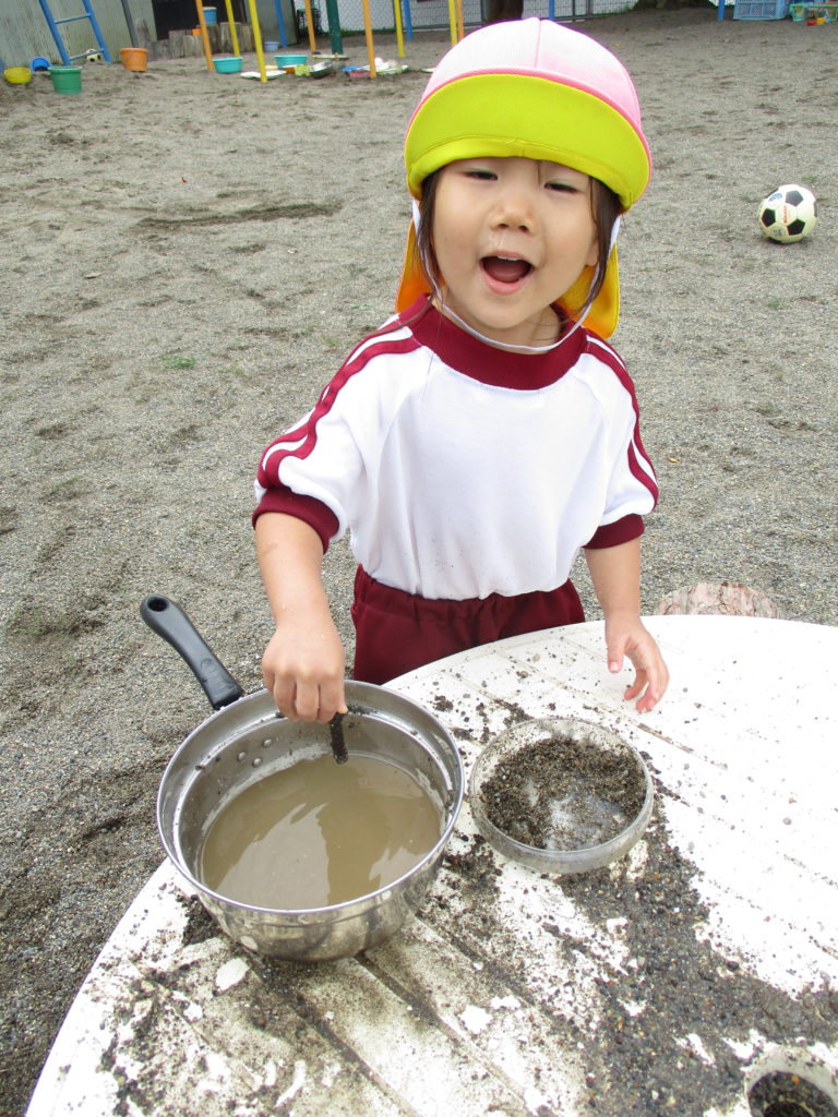 他にも、年長さんの遊びからヒントを得た子ども達は自分もやってみようと道具を使って、それぞれ水、砂、泥を楽しみます。