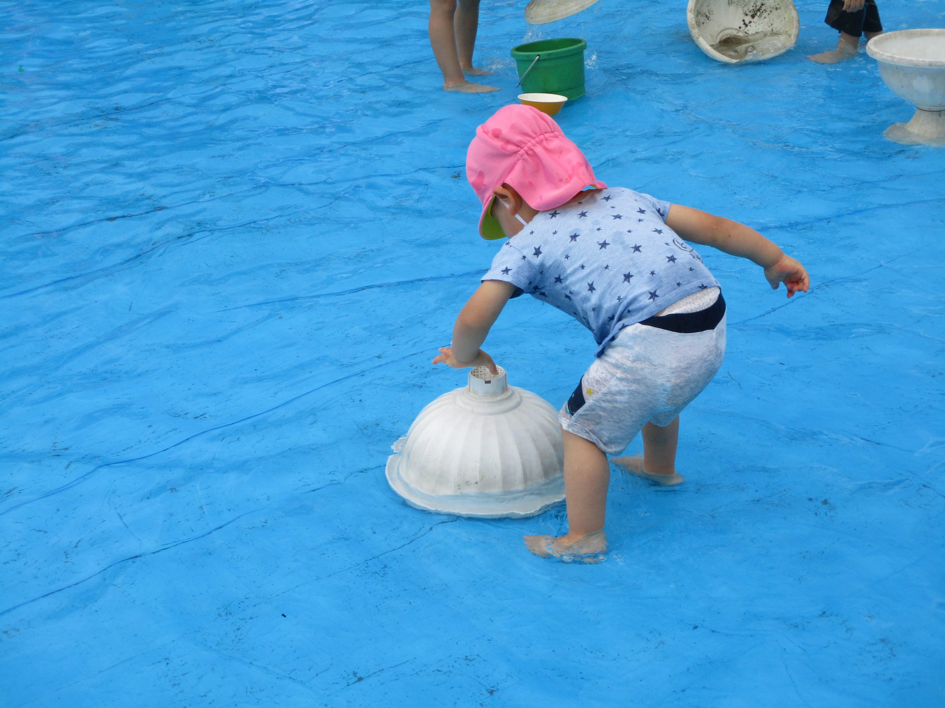 全身で水遊び♪お友達の真似をしてピチャピチャバシャバシャ。顔に水がかかってもみんな平気な様子です。