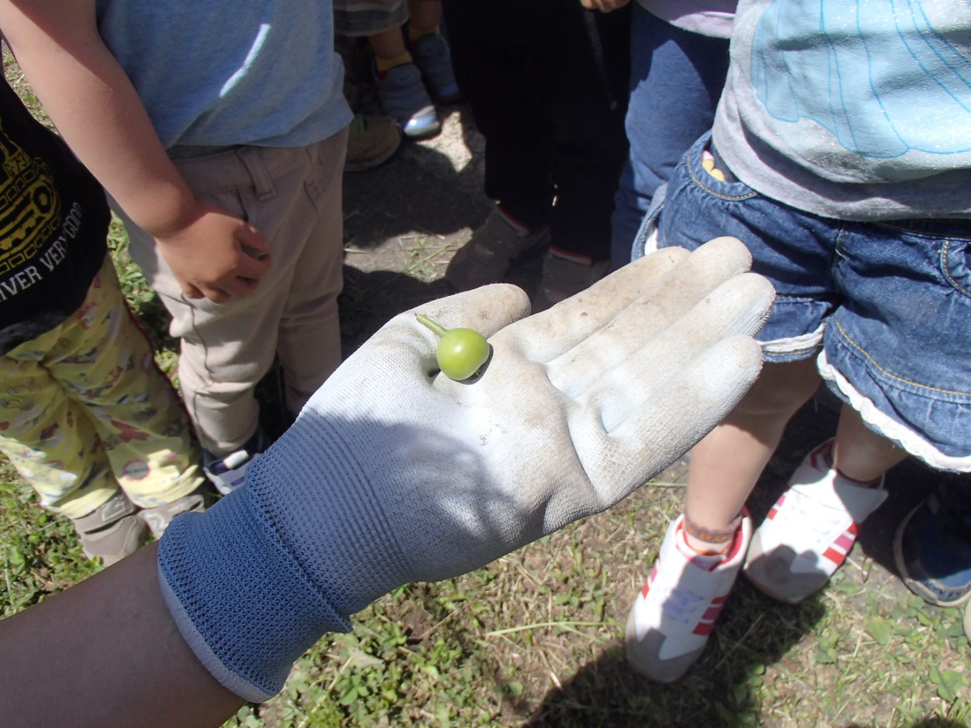散歩から園へ帰り、未満児の友だちにも梨の赤ちゃんを見せてあげました。