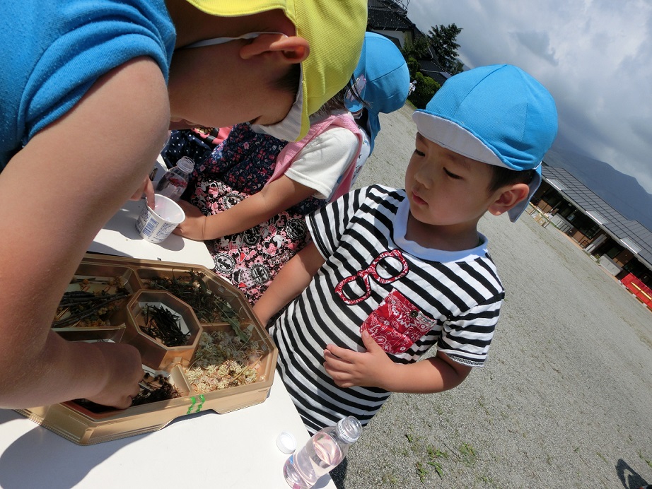 ここはハーバリウム作りです。年長児が年少児に入れる物を選んでくれています。
