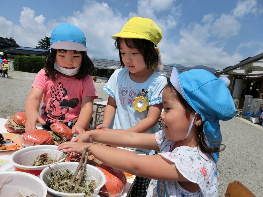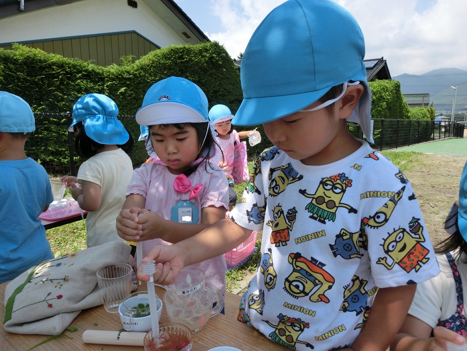 ここはハーバリウム作りです。年長児が年少児に入れる物を選んでくれています。