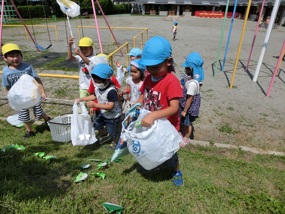 東みのわ保育園で2回目のごっこ遊びがありました。2回目は戸外で行うことが出来ました。土手で折り紙のカエル取りです。